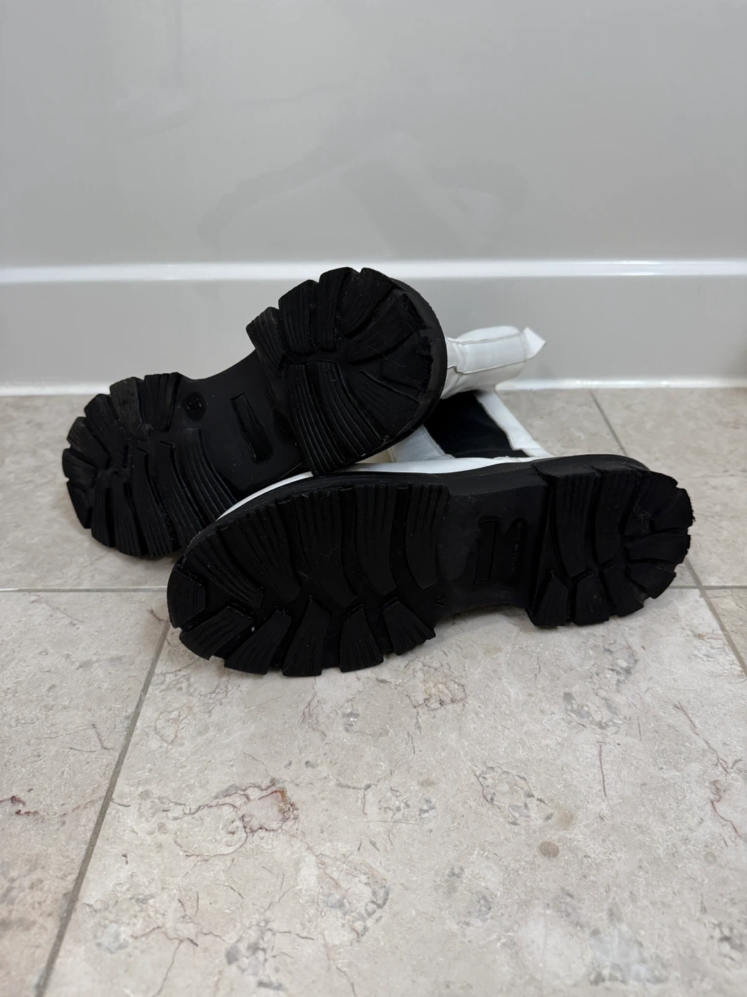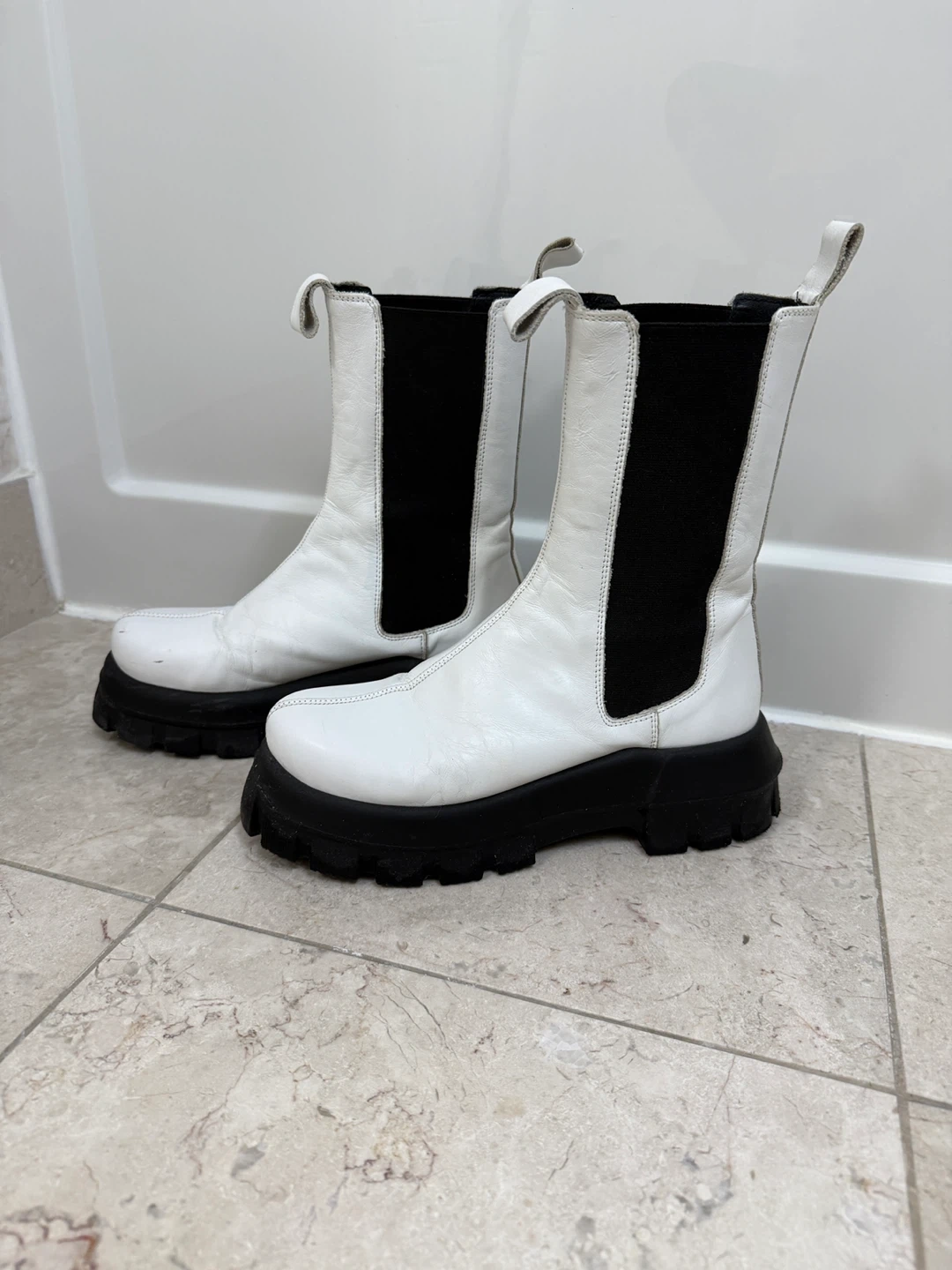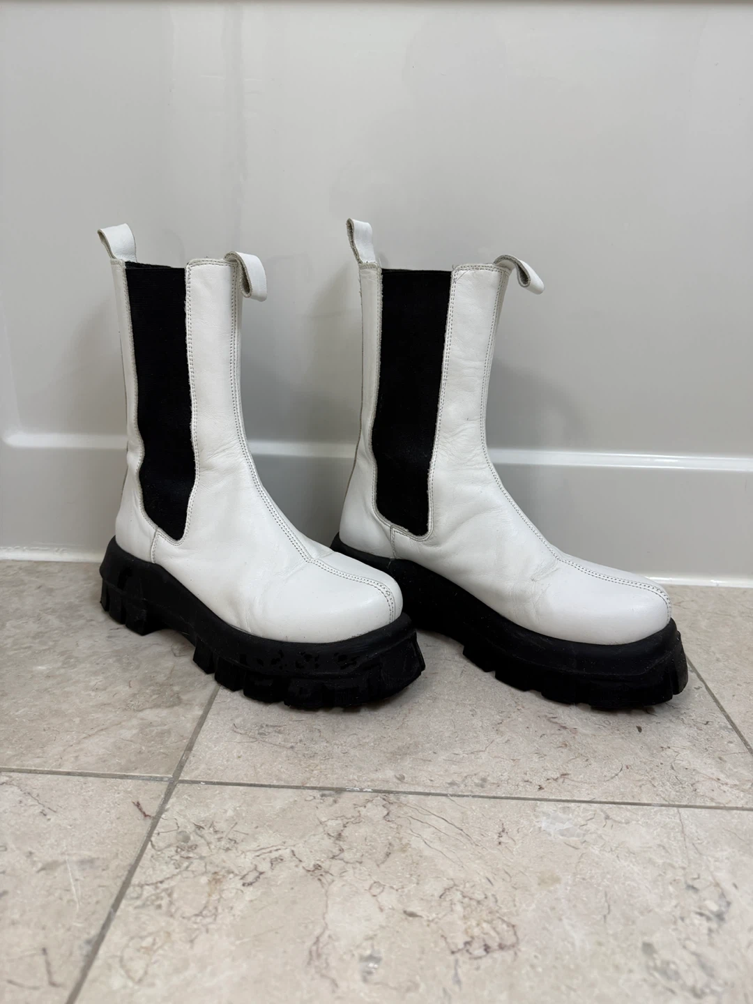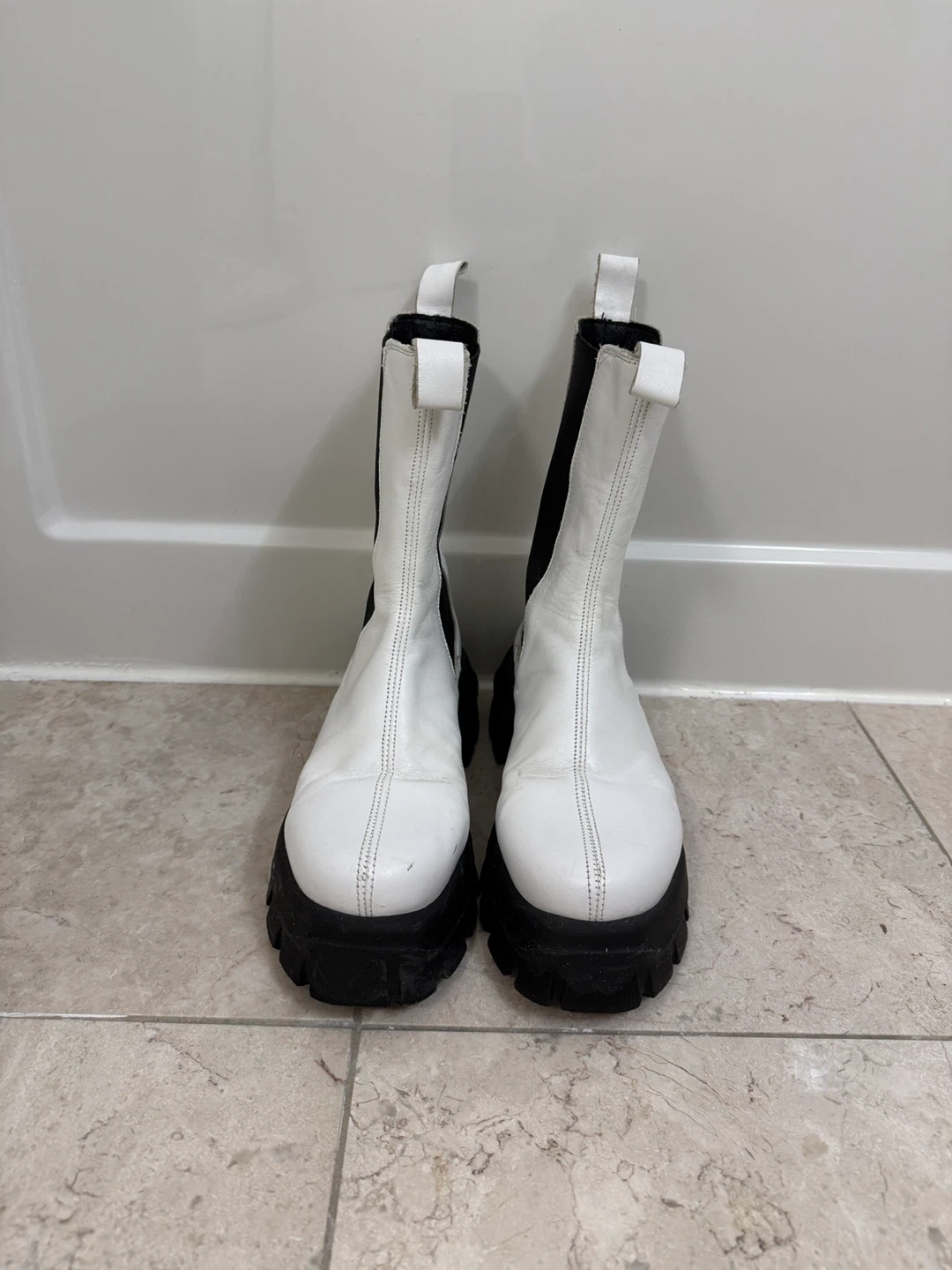 Selling a pair of white leather Chelsea boots with black elastic side panels and chunky black lug soles. They are in great condition and ready for a new home! Size 7.