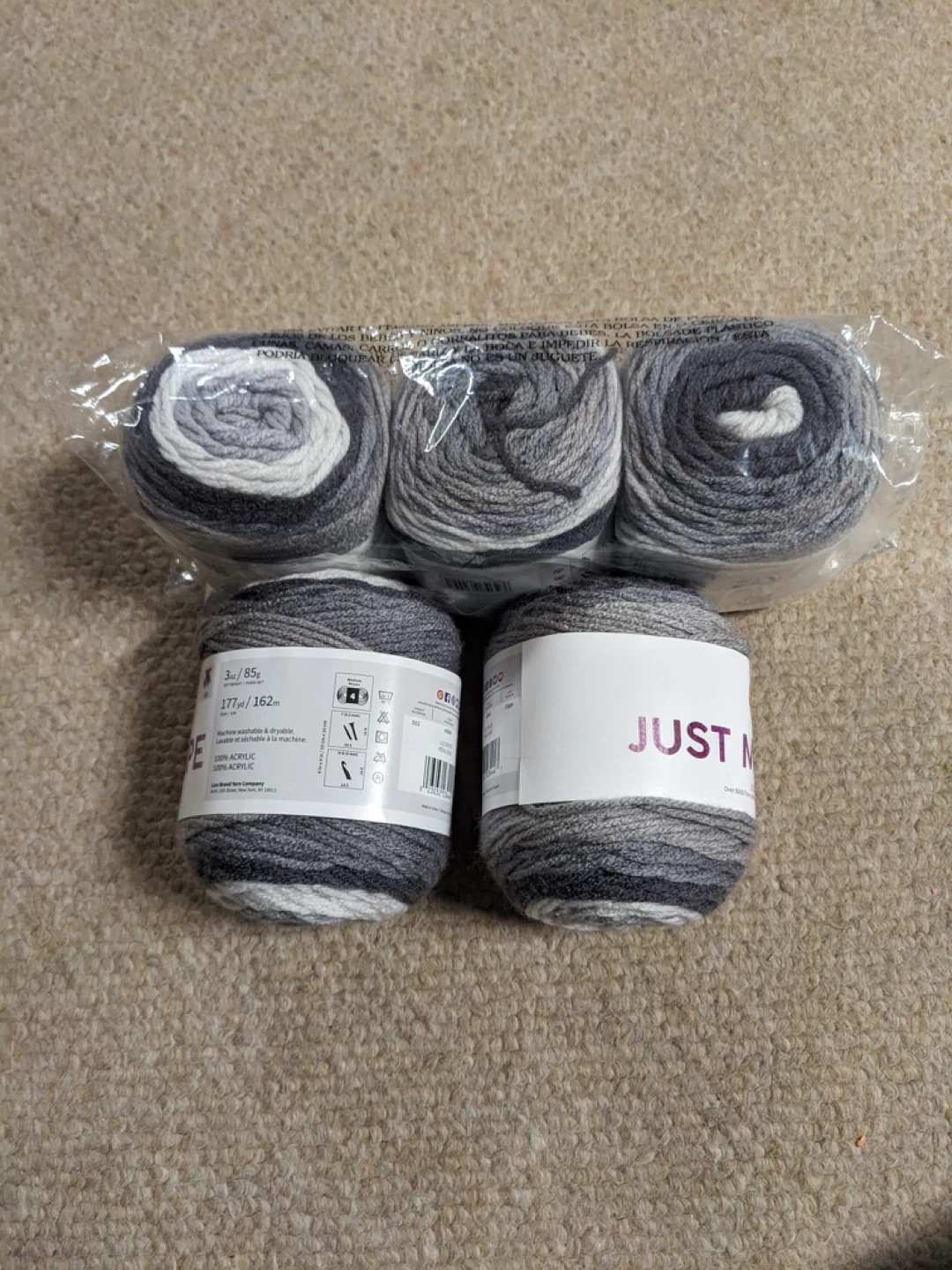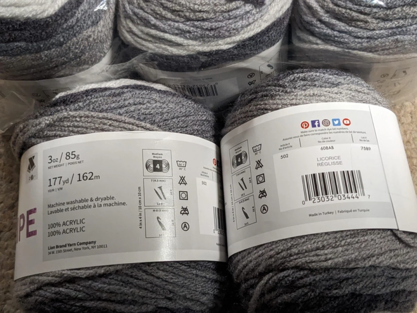 Lion Brand Just My Stripe yarn in the Licorice colourway! Each skein is 3 oz / 85 g with 177 yd / 162 m of yarn. It's machine washable and dryable, made of 100% acrylic. This is a discontinued line of yarn. $25 for all 5 skeins Free pickup near Bathurst and steeles. I’m also willing to ship at the buyers expense