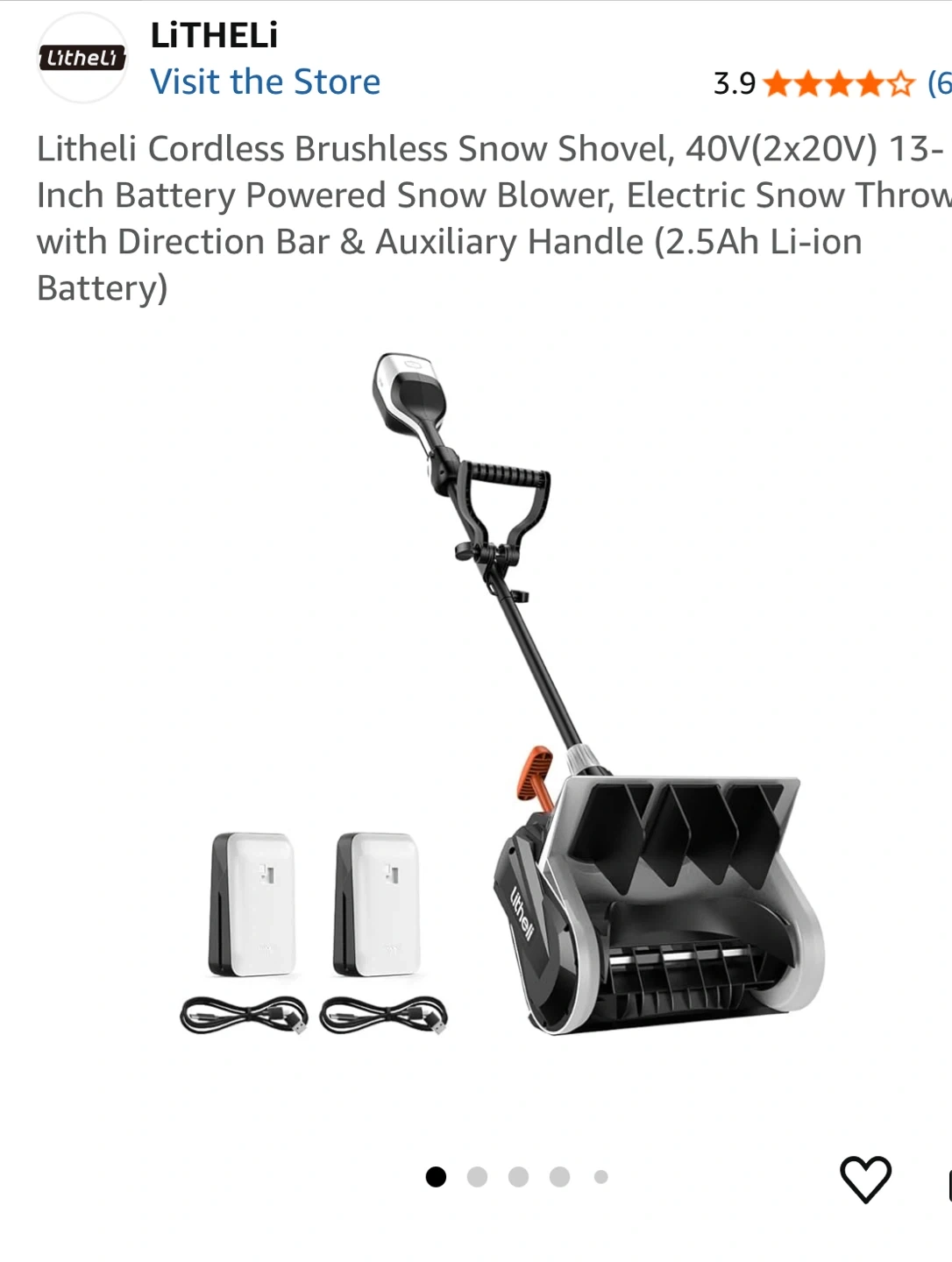 Selling a Litheli cordless brushless snow shovel. It's a 40V (2x20V) 13-inch battery-powered snow blower with a direction bar and auxiliary handle. It also comes with a 2.5Ah Li-ion battery.