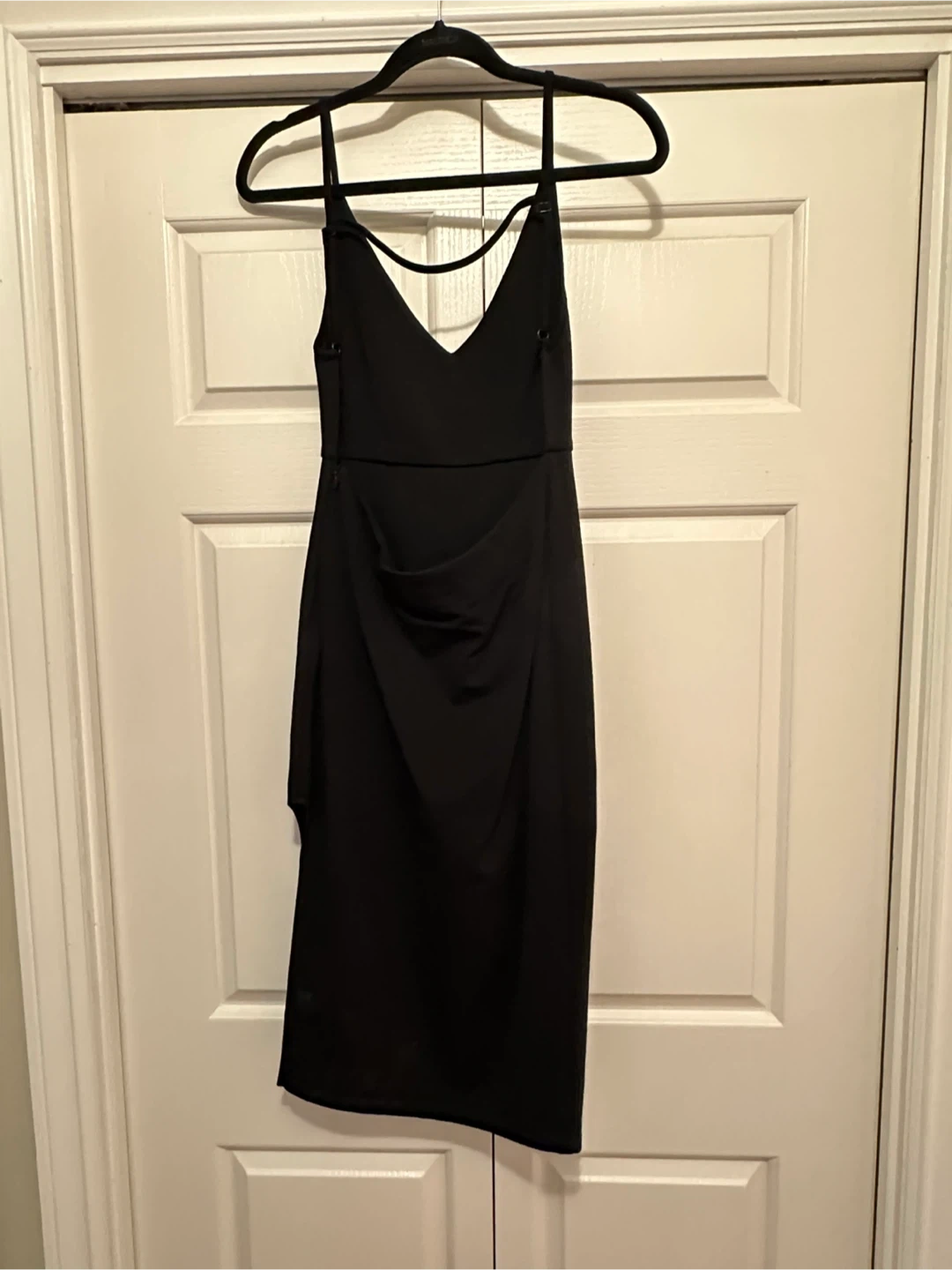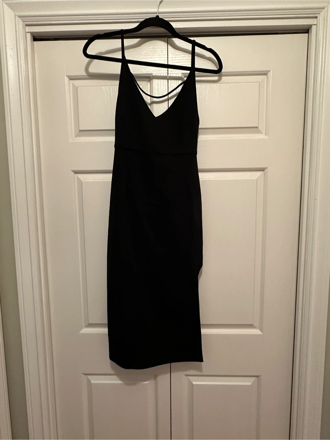 Selling a cute little black dress, low back, side slit. size small! It's in great condition and ready for a new home. It's a simple but elegant dress that would be perfect for a night out or a special occasion