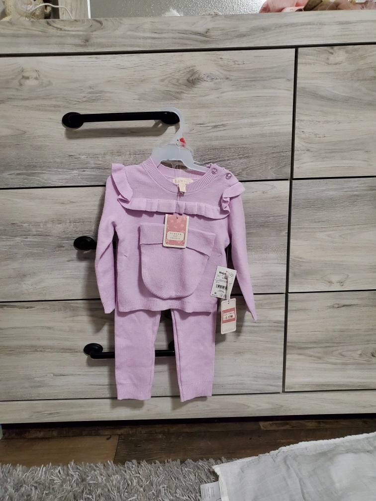 Adorable lavender coloured baby girl's two-piece sweater and pant set. cute ruffles Size 6-12M.