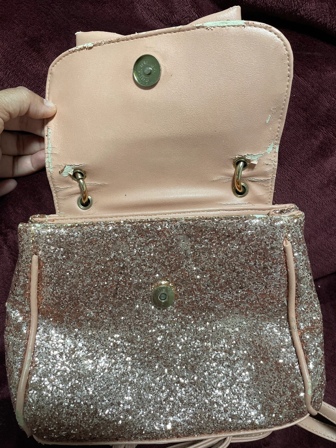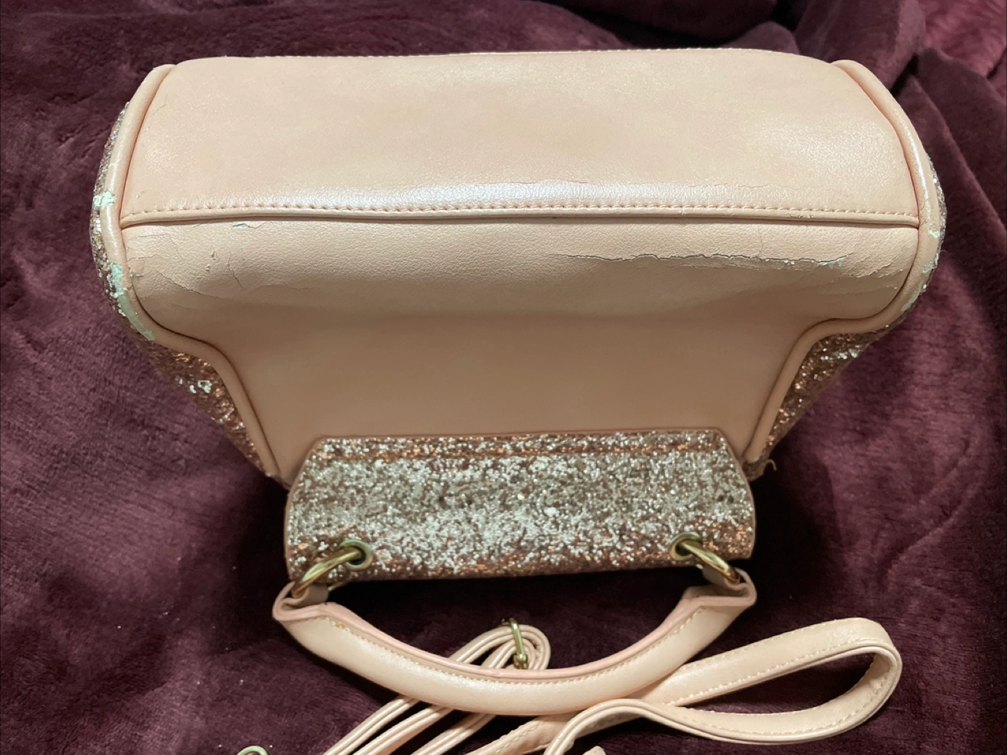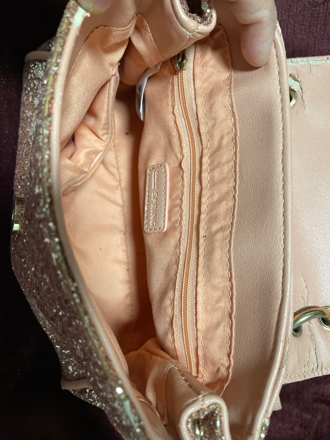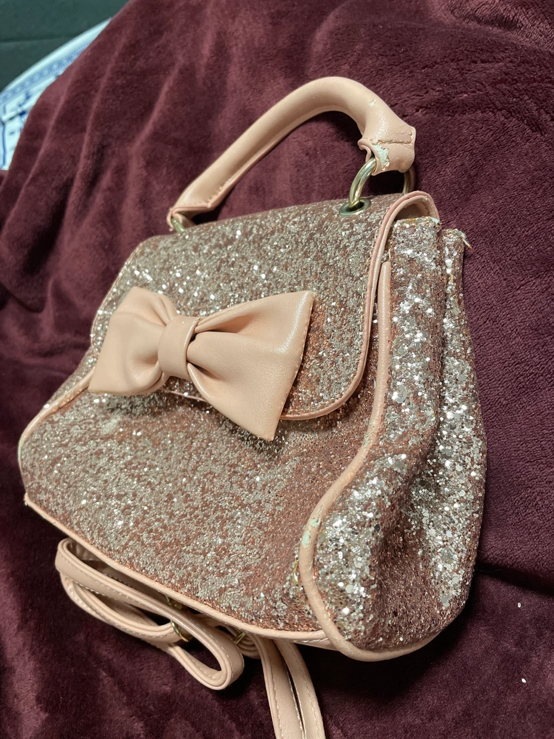 This is a purse in light pink with a sparkly exterior and a bow. It has some wear and tear at the back and inside as shown in the pictures, but it's still very cute and functional! The brand is Call It Spring.