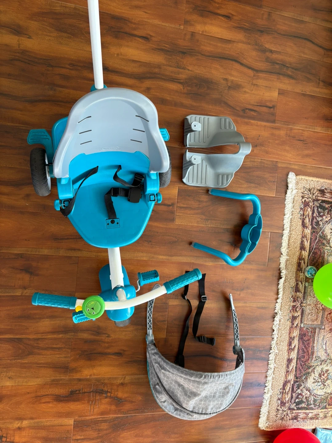 Selling a Little Tikes 4-in-1 Trike in great condition! This trike is perfect for growing with your child, offering different stages of use. It comes with all the pictured components, including the footrests and parent handle. The trike features a safety harness, adjustable seat, and a convenient storage bucket at the back. Ready for new adventures!