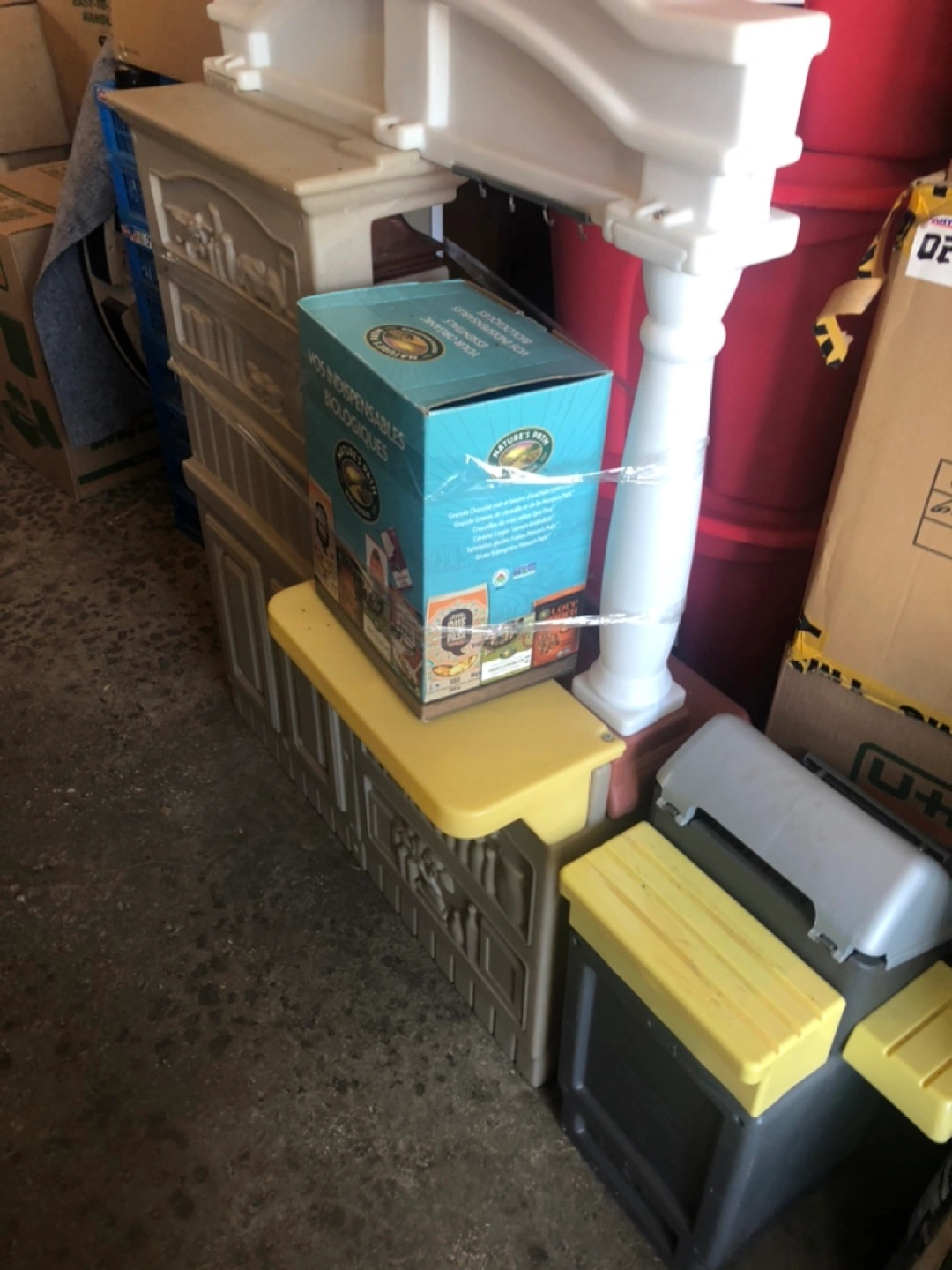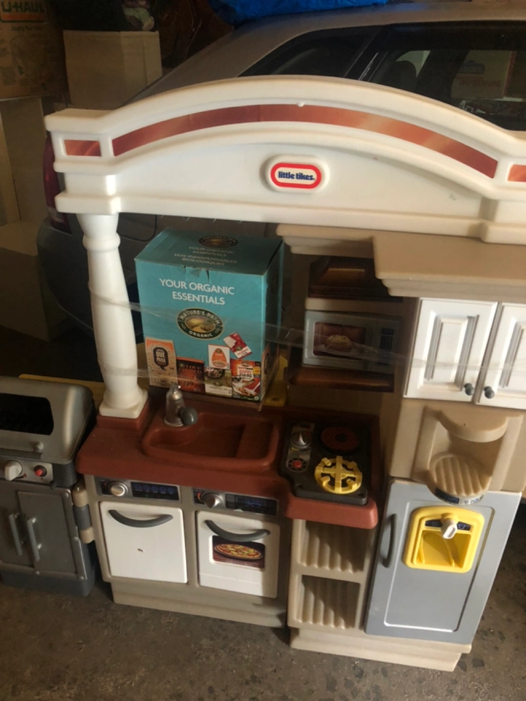 Large plastic children's kitchen. Features stove, oven, sink, microwave, and fridge. Good condition. Some minor scuffs and scratches. Only ever used outside Kitchen food comes with it in two boxes