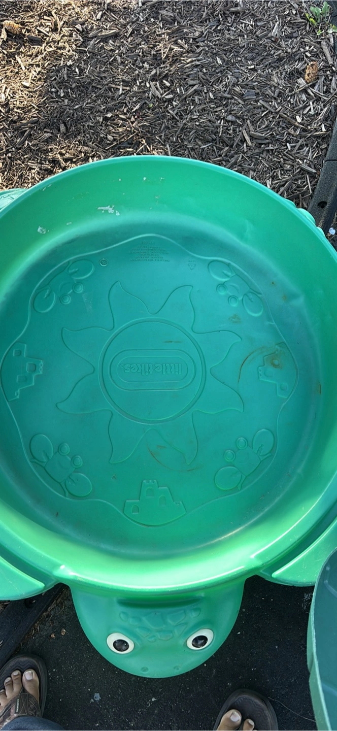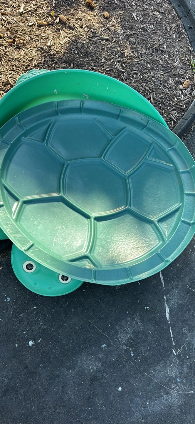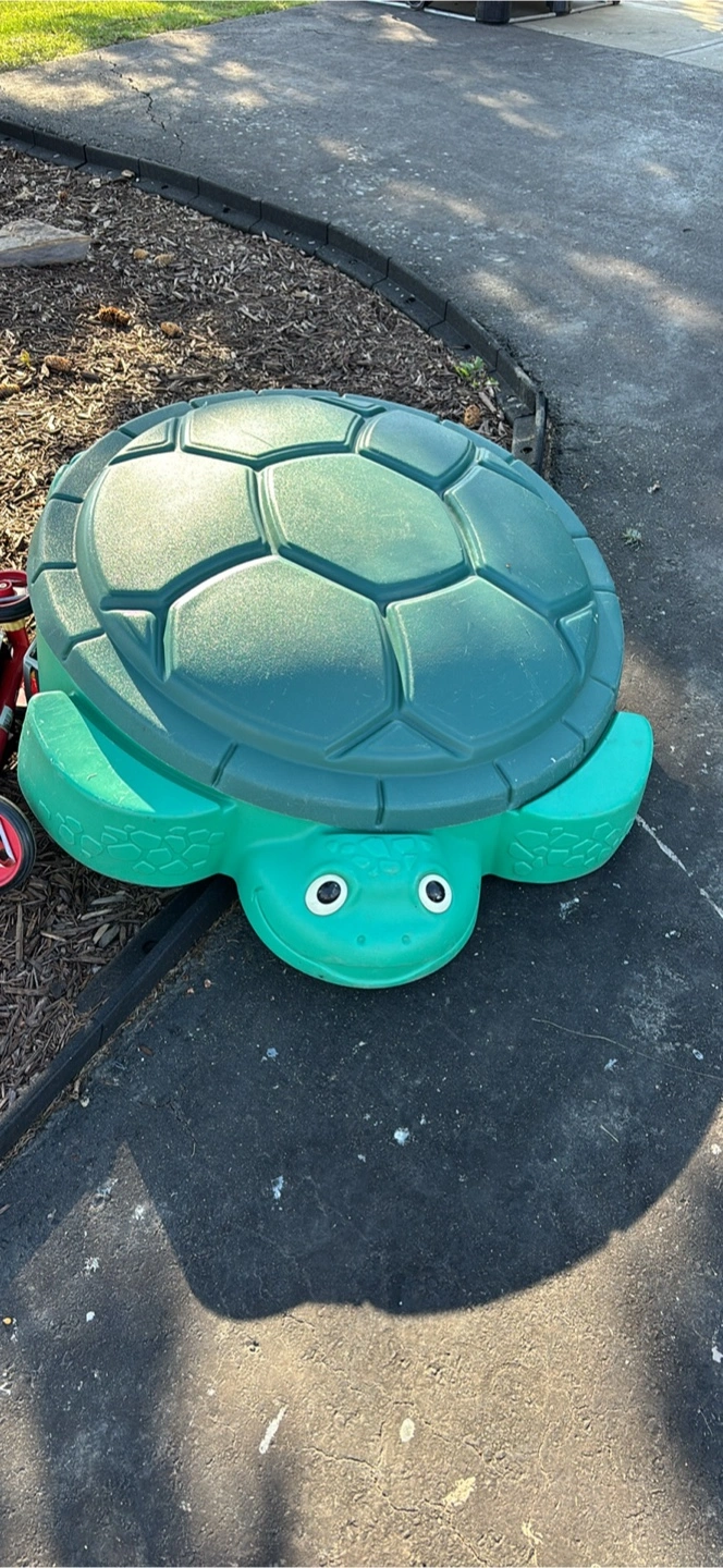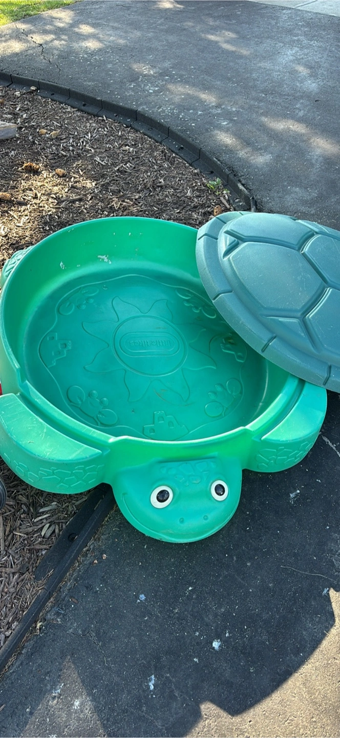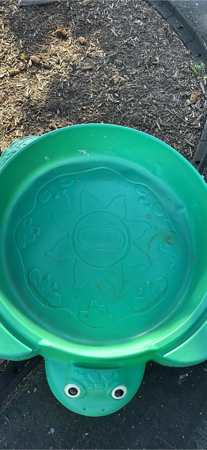Here's a Little Tikes turtle sandbox, complete with its lid! It's green and ready for some fun in the sun. Perfect for kids to enjoy some outdoor playtime