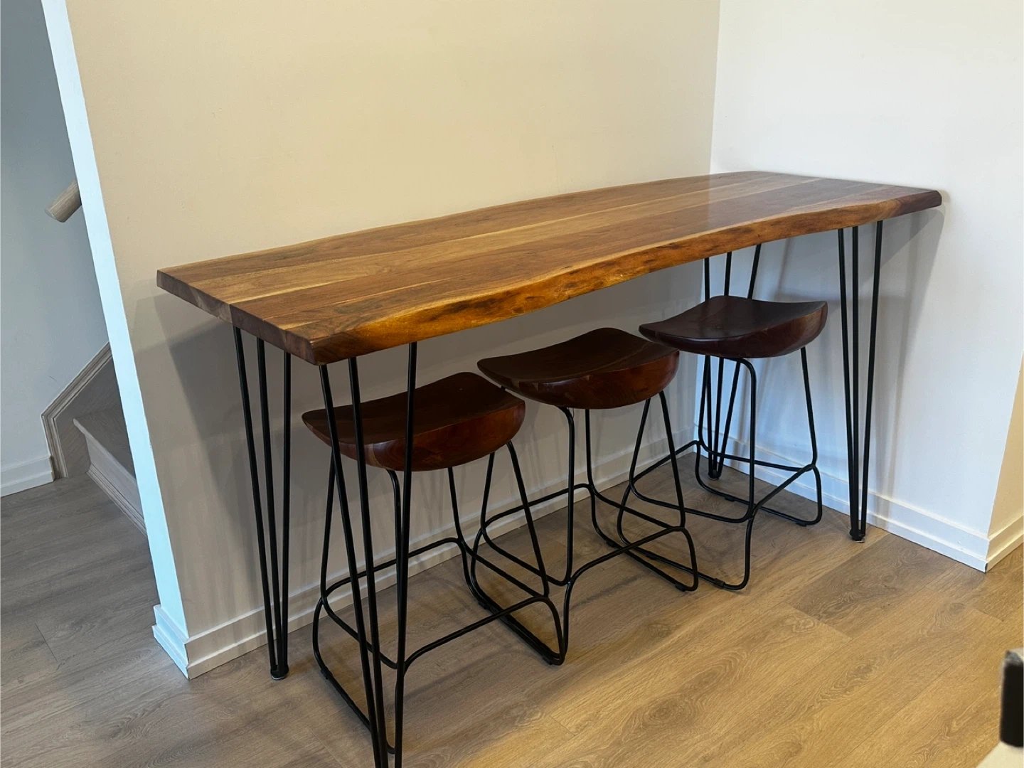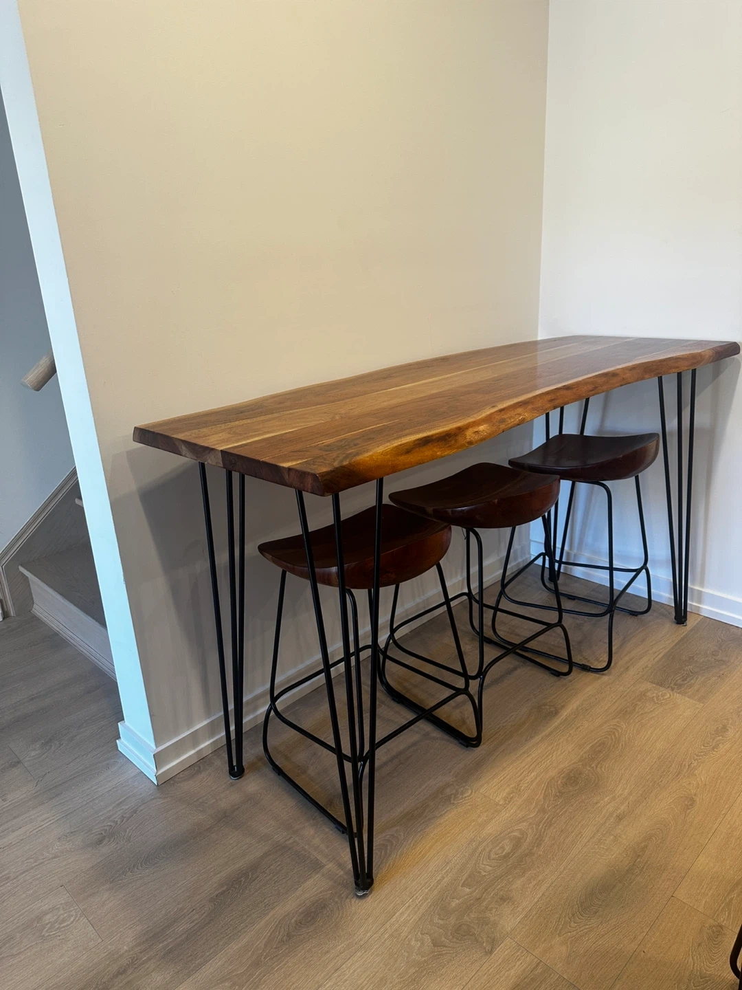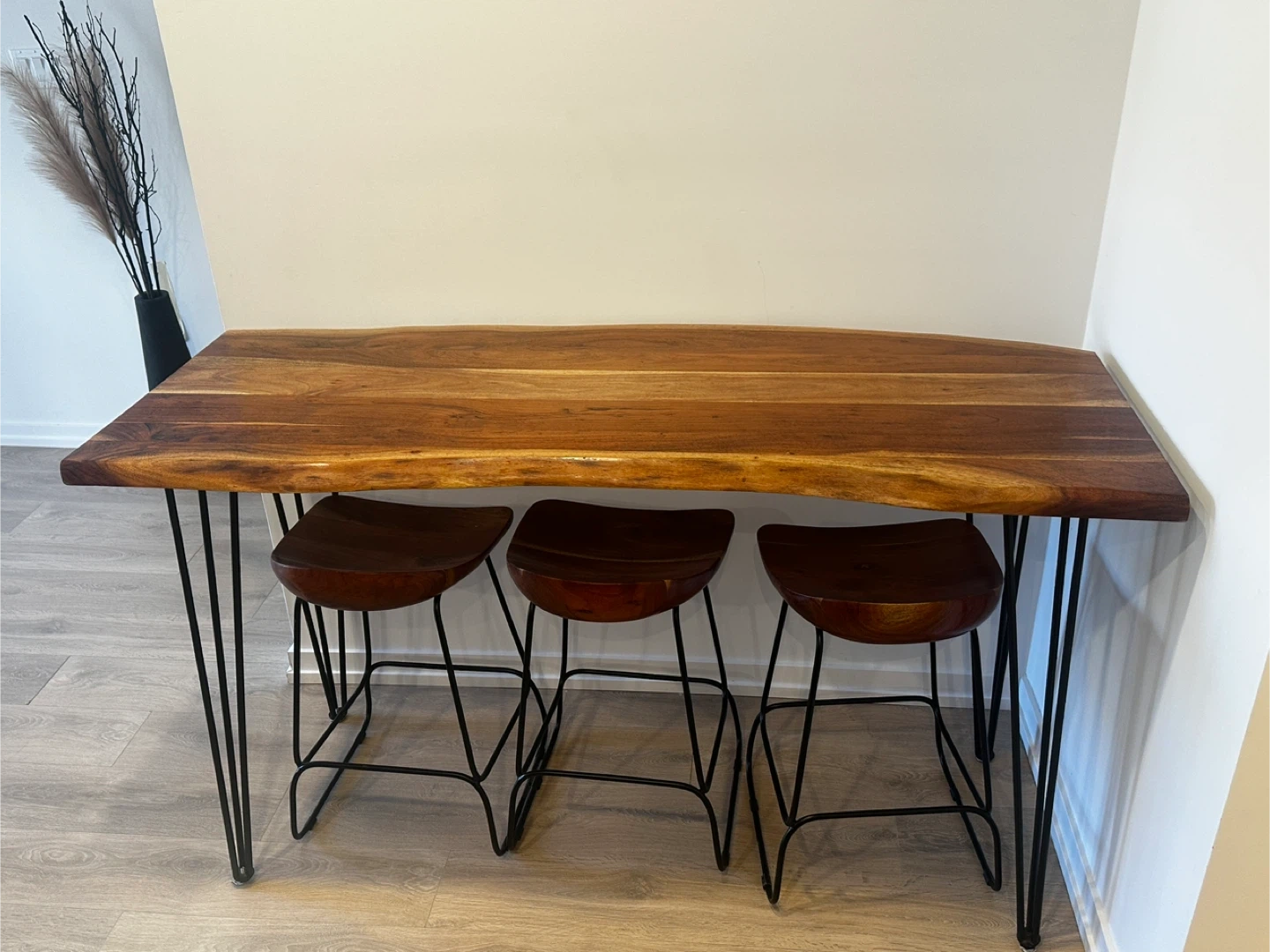 Selling a beautiful live edge wood bar table paired with four matching stools. The table features a unique, natural edge and sleek hairpin legs. The stools are designed for comfort and style, complementing the table perfectly. This set would be a great addition to any home looking for a rustic and modern touch. Table for Stractube Chairs for Ashley