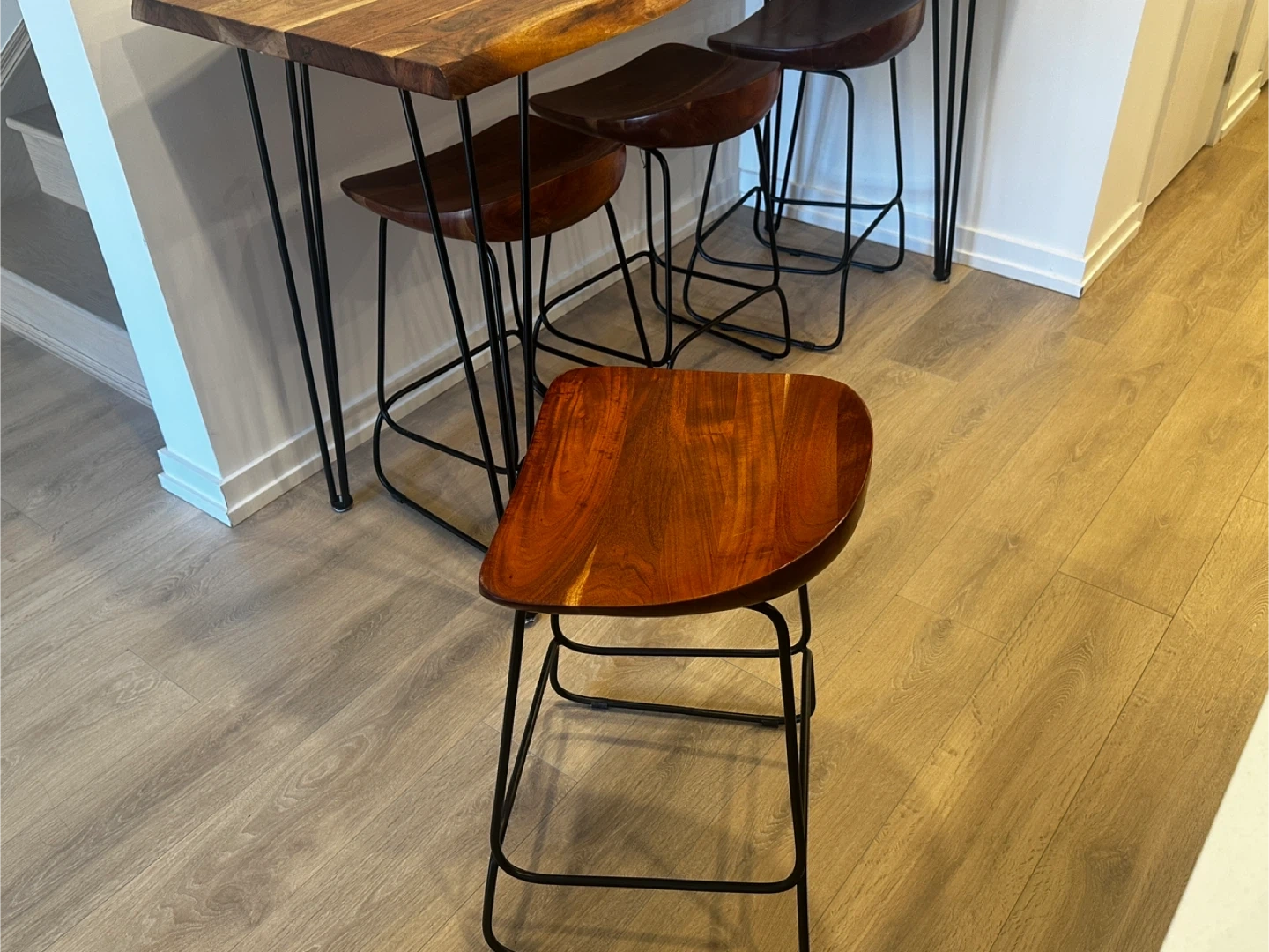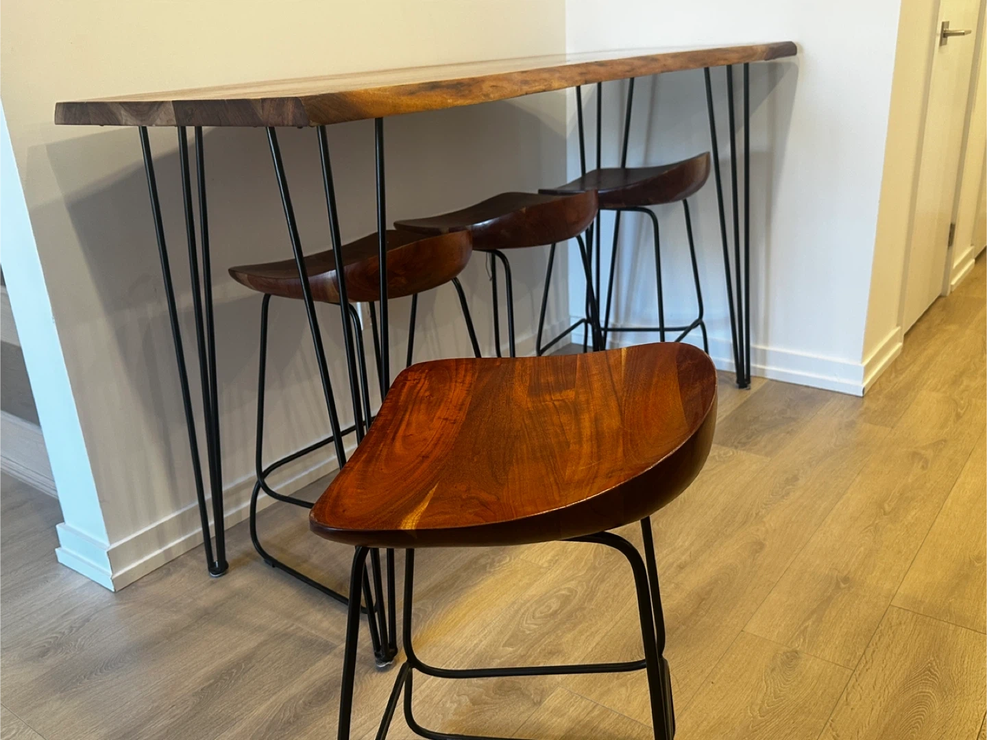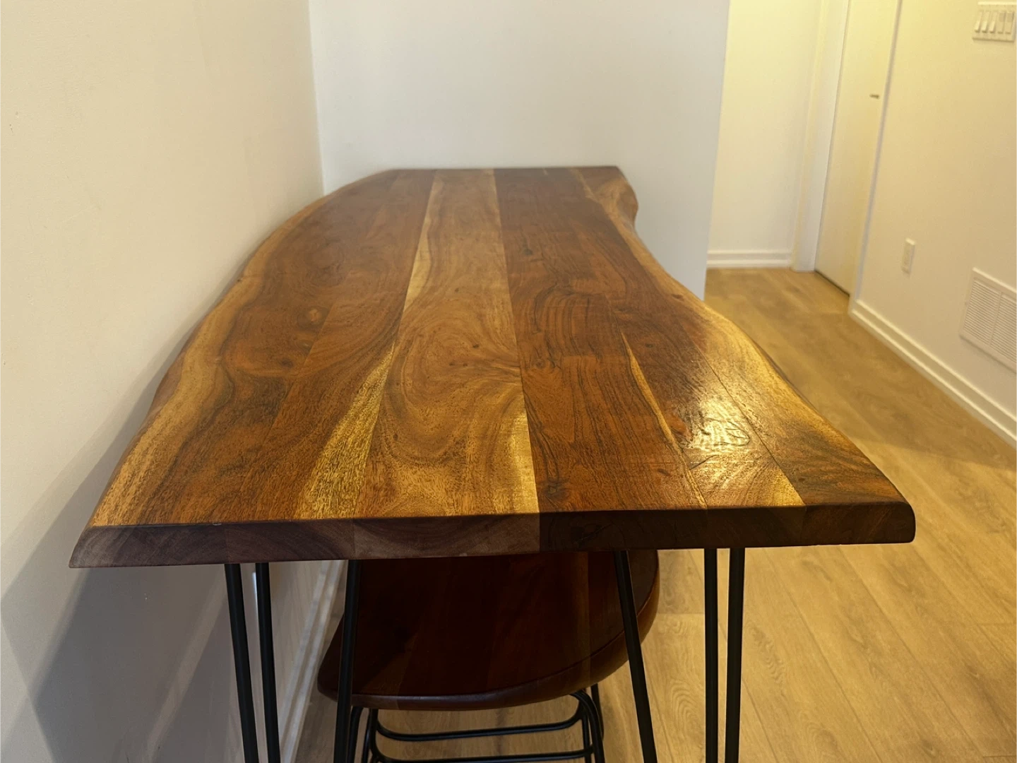 Selling a beautiful live edge wood bar table paired with four matching stools. The table features a unique, natural edge and sleek hairpin legs. The stools are designed for comfort and style, complementing the table perfectly. This set would be a great addition to any home looking for a rustic and modern touch. Table for Stractube Chairs for Ashley