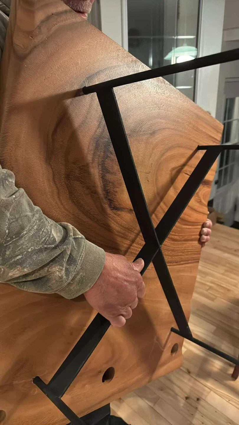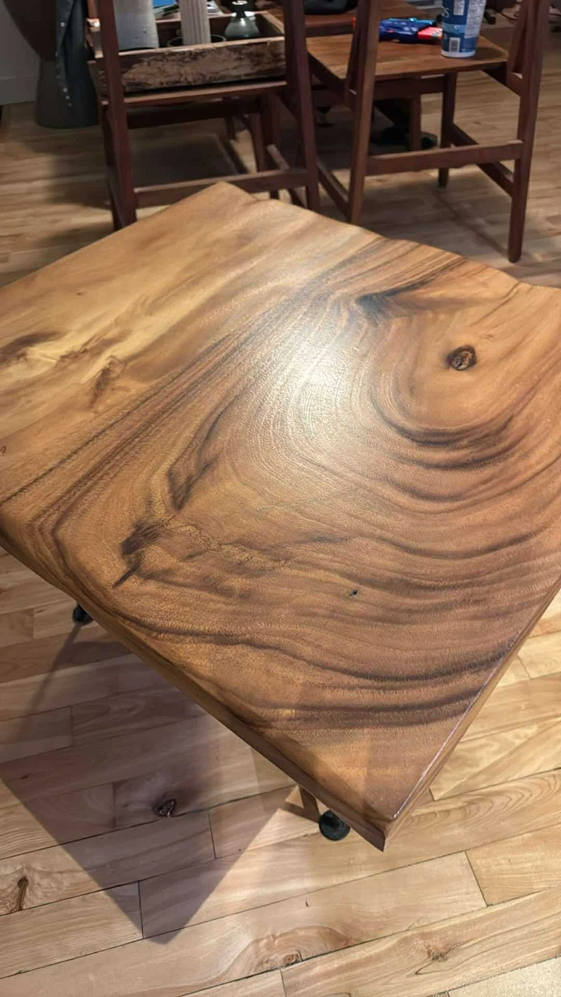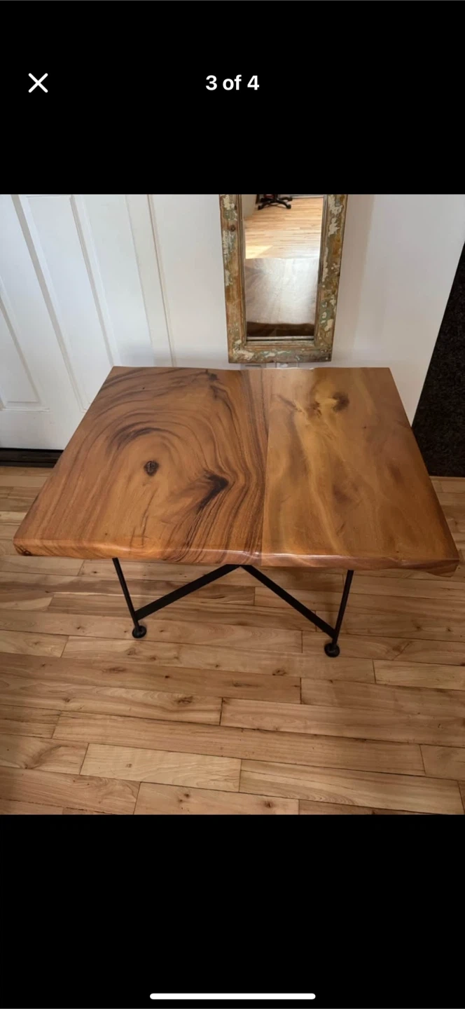 Selling a beautiful live edge wood coffee table. It has a unique wood grain pattern and sturdy black metal legs. It's in great condition and would be a lovely addition to any living room!