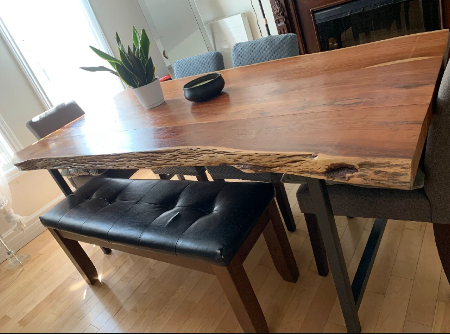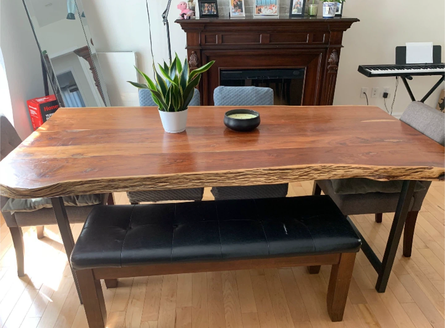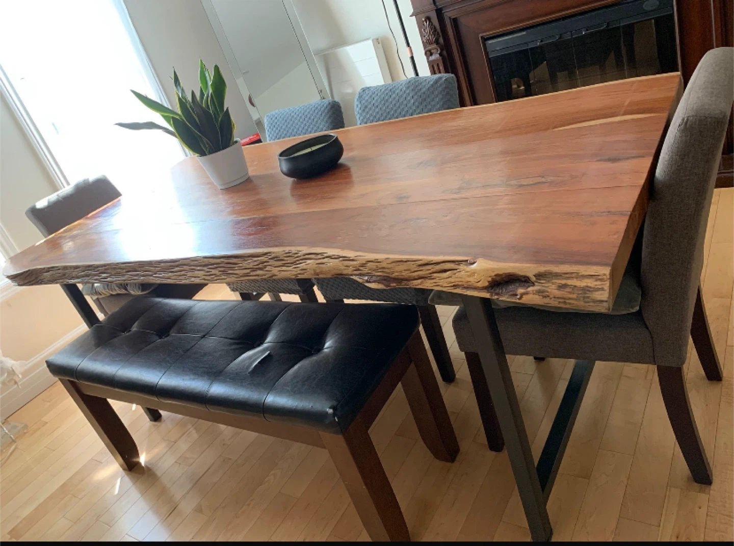 Selling a beautiful live edge wood dining table. It's a stunning piece that would look great in any home! The table has a unique, natural edge and a warm, inviting wood grain. The legs are a sturdy metal. Dimensions 82”length by 37” width by 30”height You will need at least three people to lift and carry $400