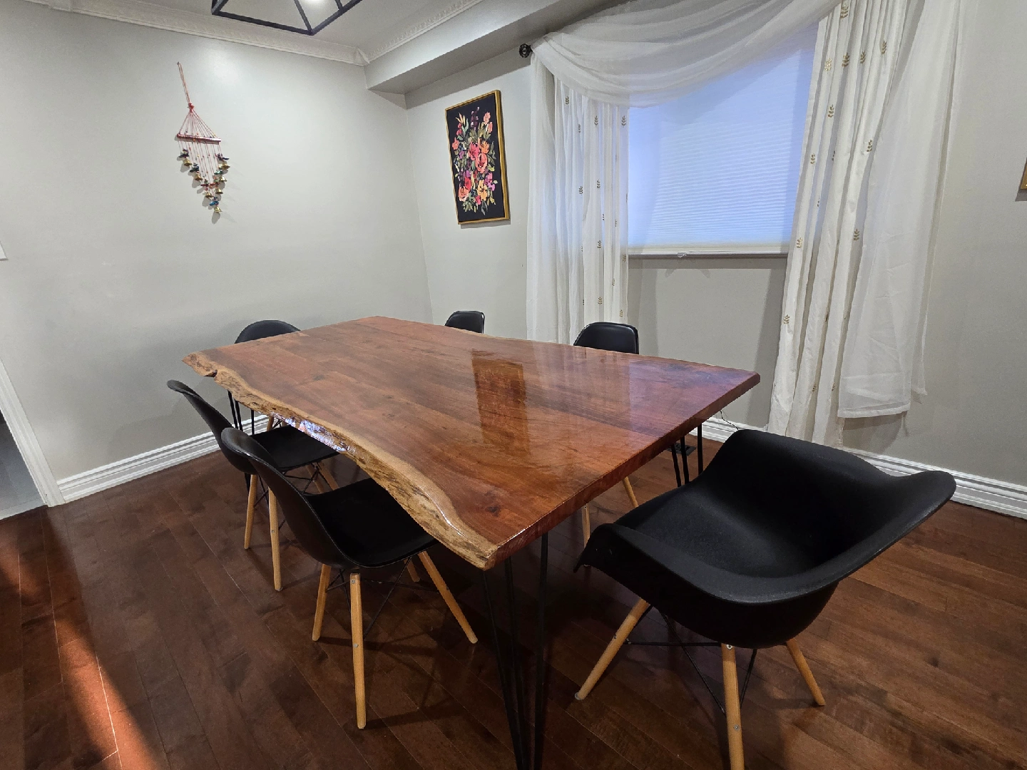Selling a beautiful live edge wood dining table with epoxy finish.. The table has a unique natural edge and is paired with modern black chairs. It's a stunning piece that would be a great addition to any dining room! Length: 82.5 inch Windth: 40 inch Height : 30.5 inch