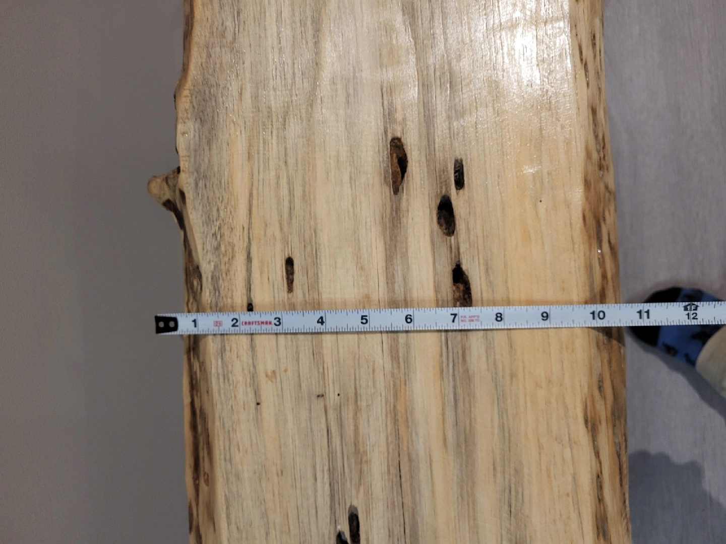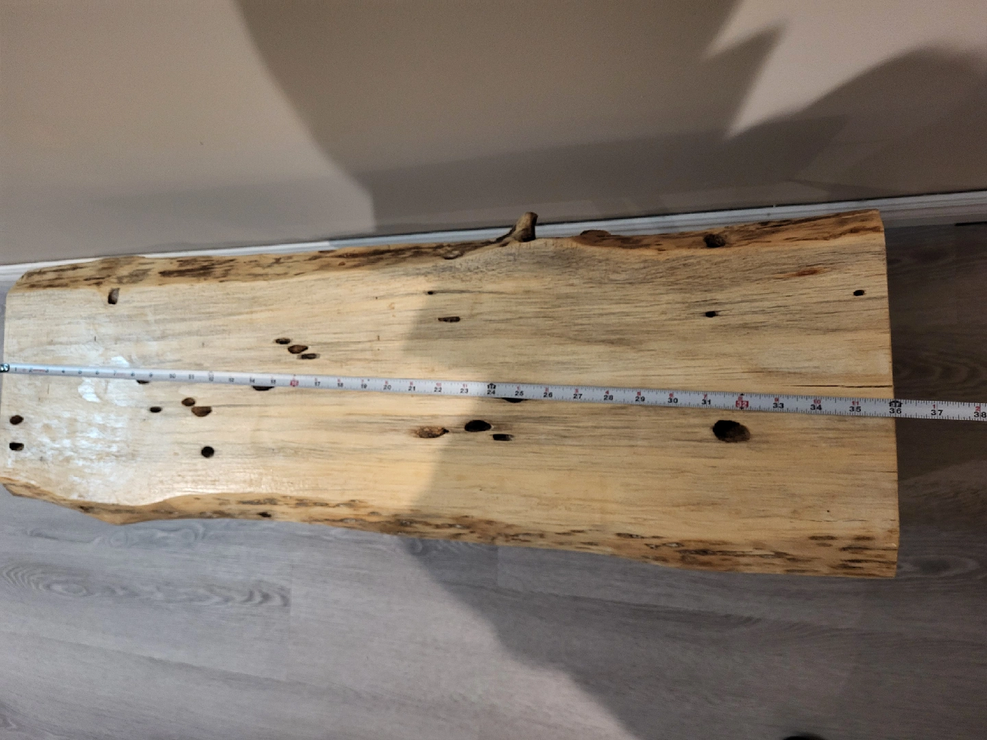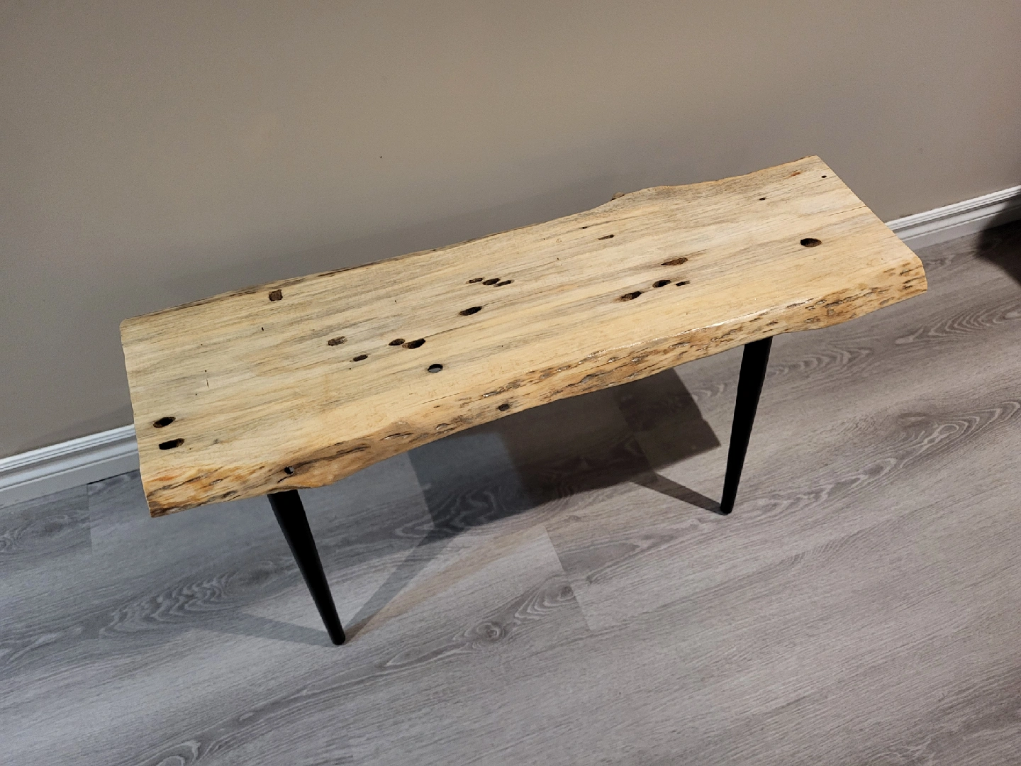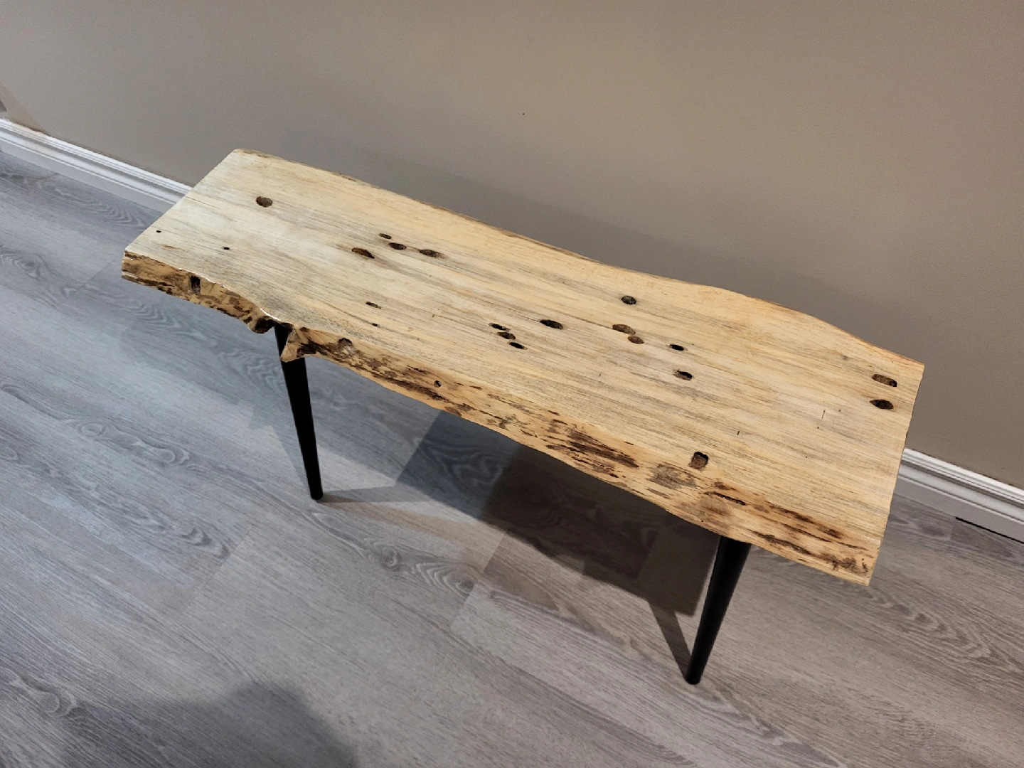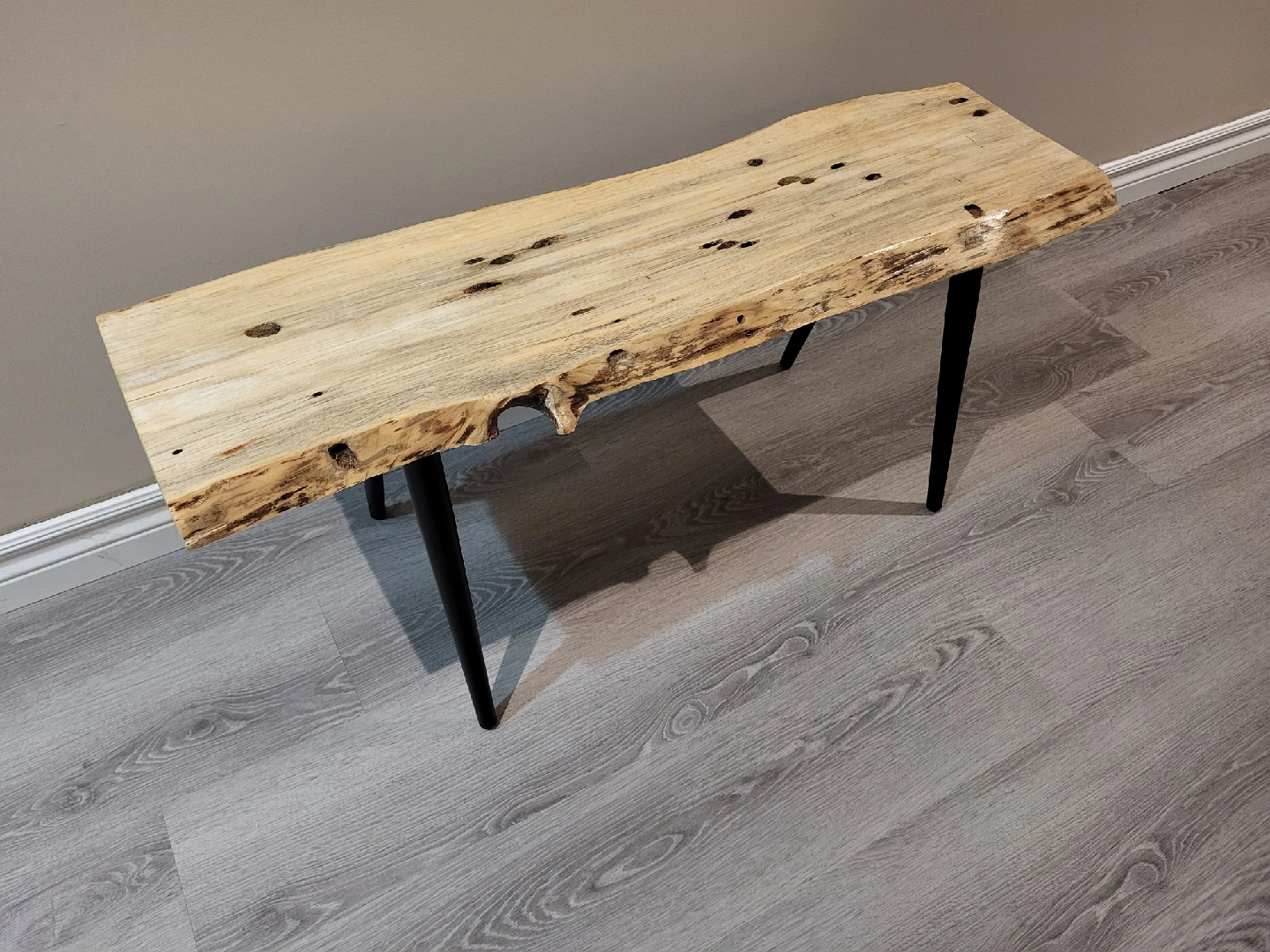 Selling a unique live edge wood side table! It features a beautiful, natural wood top with distinctive markings and black metal legs. The top measures approximately 11 inches in width, and 3 feet in length. about 17 inches tall.
