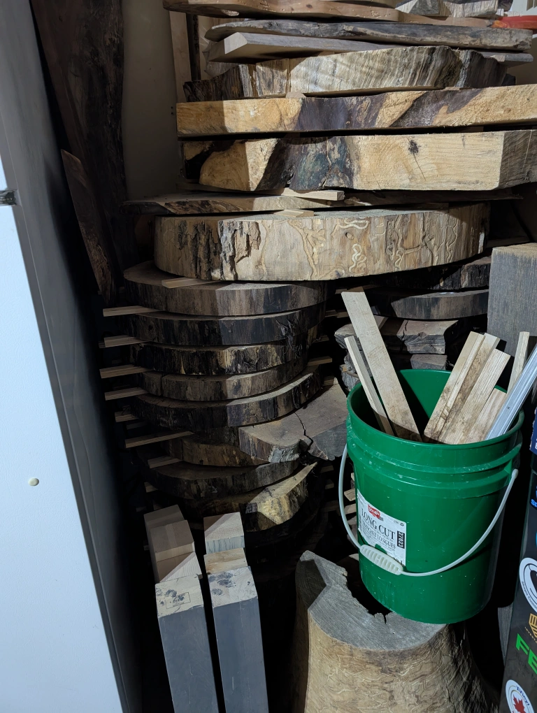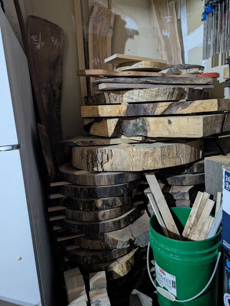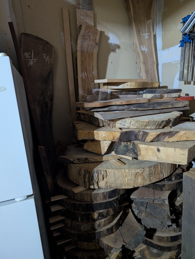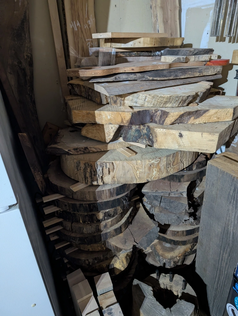 Assortment of live edge wood slabs, various sizes and thicknesses. Great for woodworking projects. Some slabs are round, others rectangular. Includes both thicker and thinner pieces. Species varies - walnut, white cedar, pine, maple, ash Discounts for multiple pieces purchased.