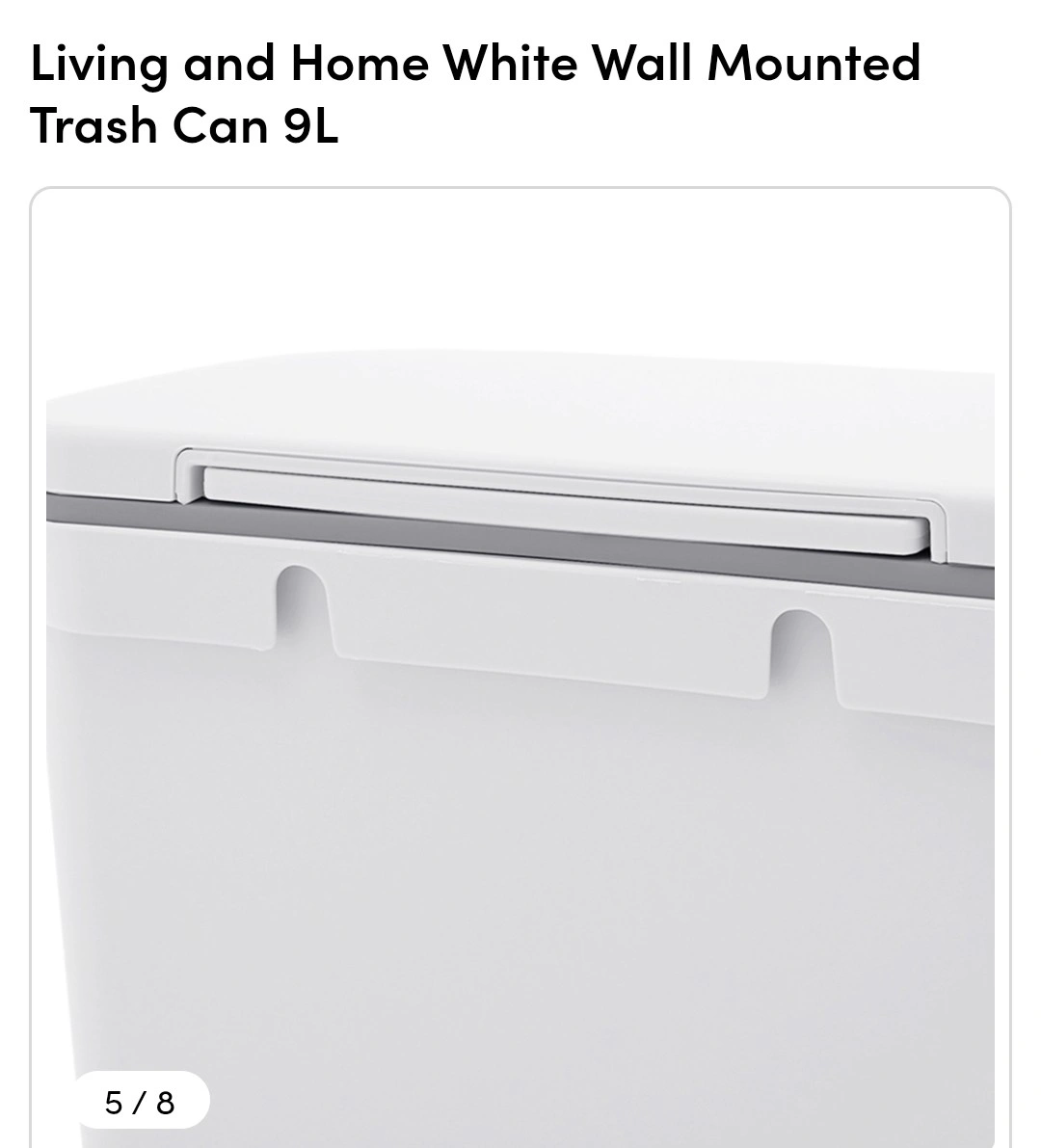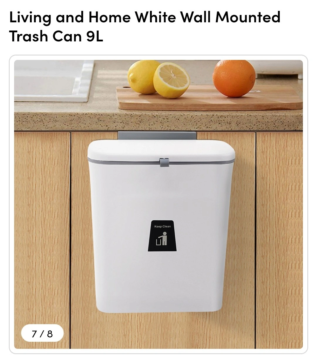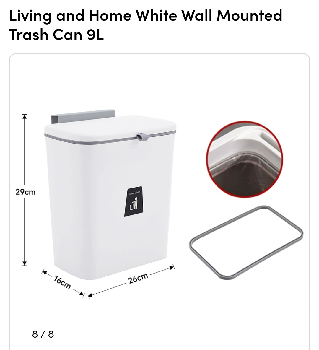 This is a Living and Home white wall mounted trash can with a 9L capacity. It's perfect for keeping your space clean and tidy. The dimensions are approximately 29cm in height, 26cm in width, and 16cm in depth. The design includes a convenient lid and a frame to hold the trash bag in place. It's in great condition and ready for a new home!