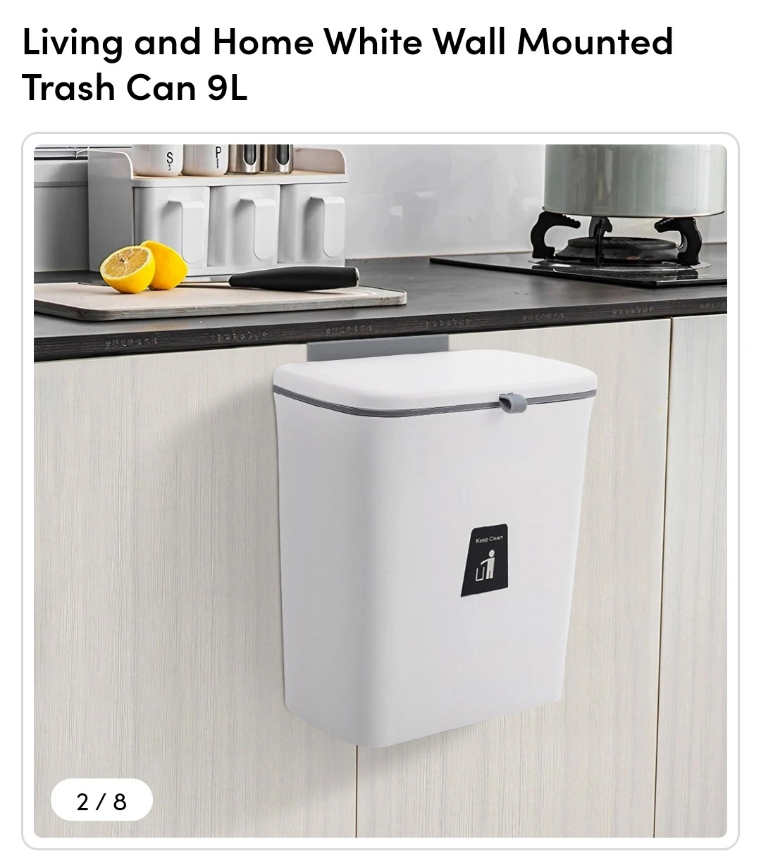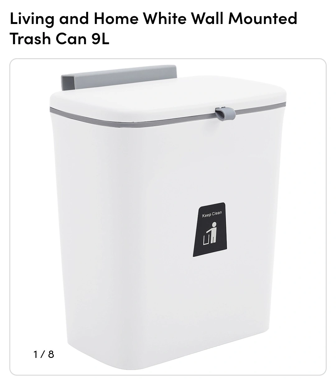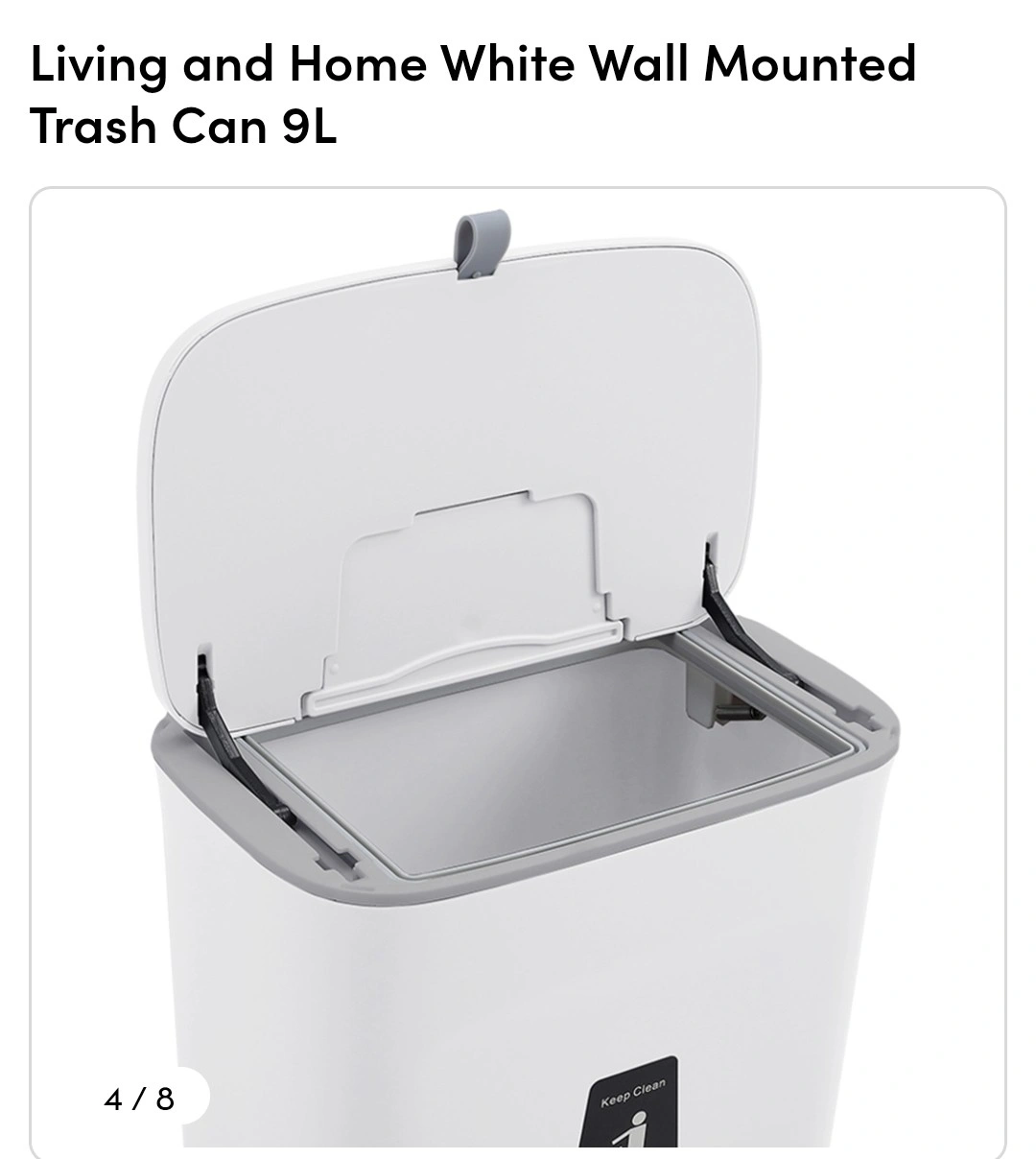This is a Living and Home white wall mounted trash can with a 9L capacity. It's perfect for keeping your space clean and tidy. The dimensions are approximately 29cm in height, 26cm in width, and 16cm in depth. The design includes a convenient lid and a frame to hold the trash bag in place. It's in great condition and ready for a new home!