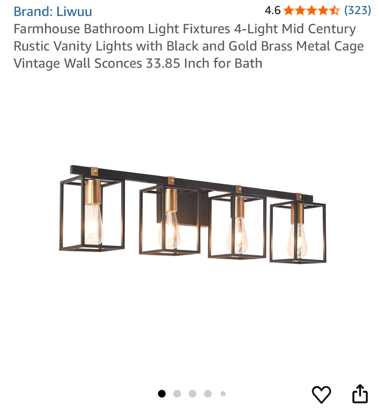 Selling a Liwuu farmhouse bathroom light fixture! It features a 4-light mid-century rustic vanity design with a black and gold brass metal cage. The vintage wall sconces measure 33.85 inches, perfect for adding a touch of rustic charm to your bathroom