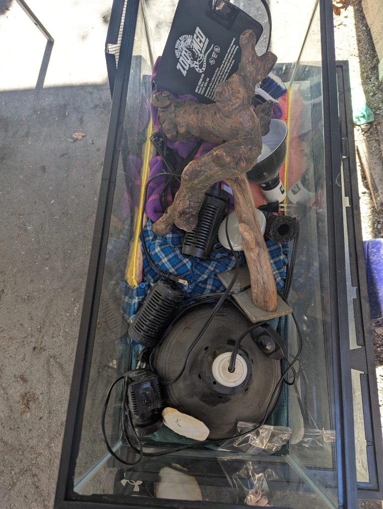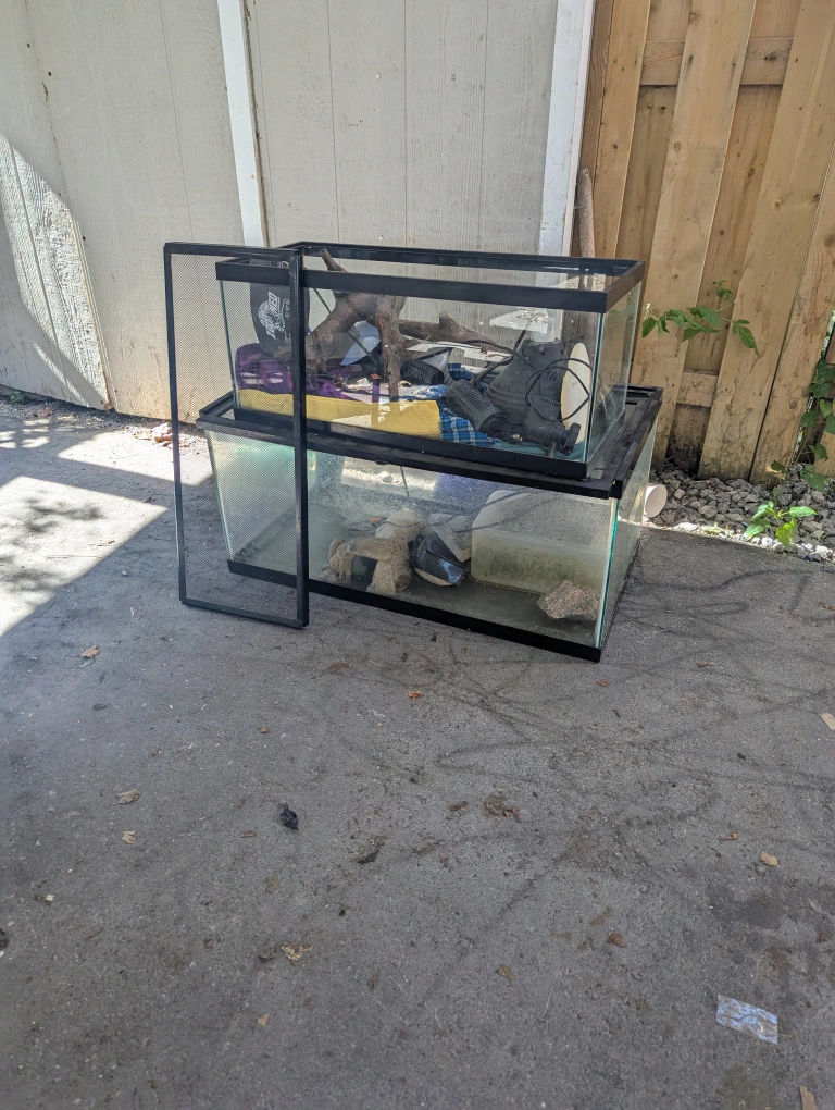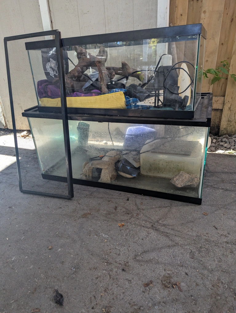 Two tanks 25 and 50 Gallon Lights Heating Pad pump for water tree climbers for lizards stone shelter