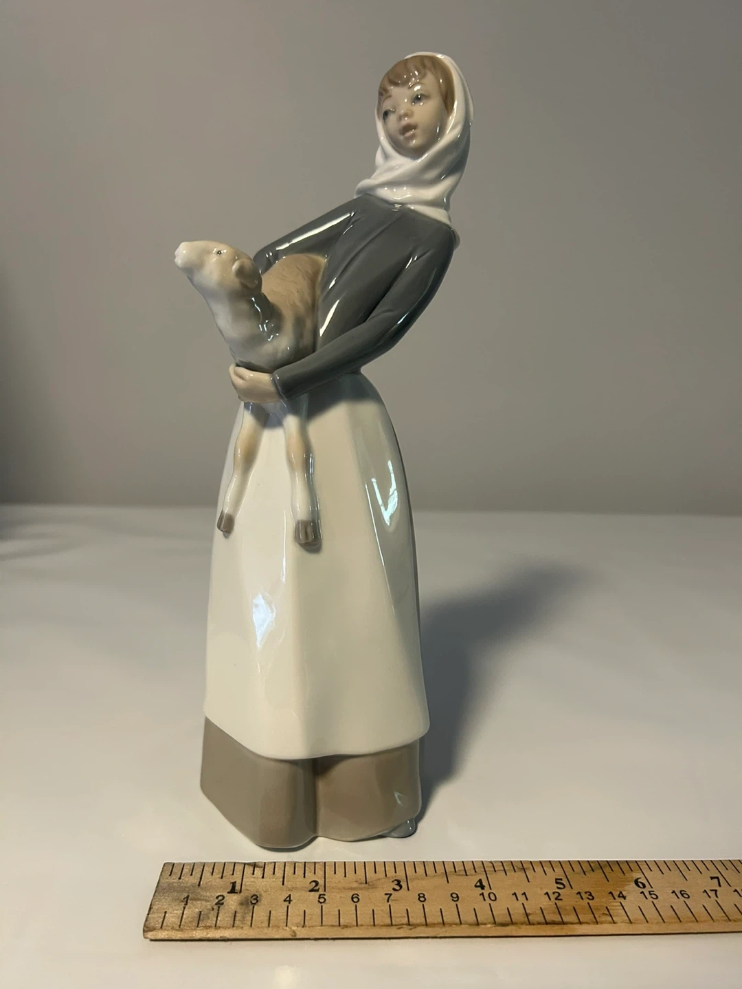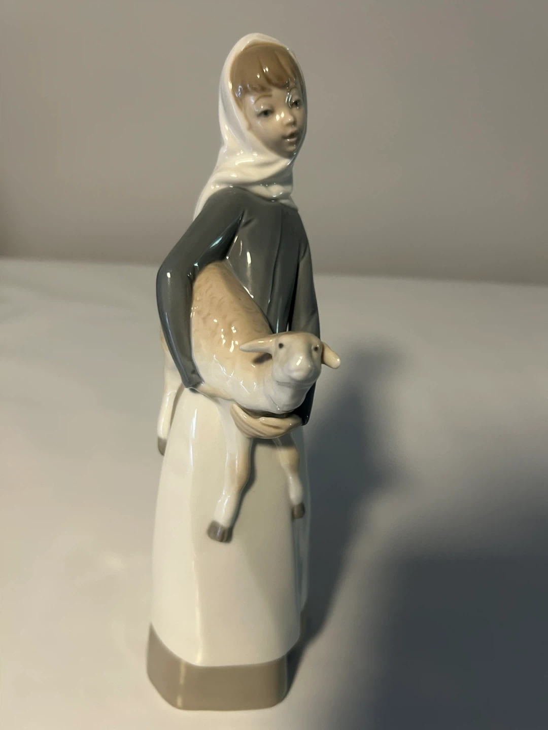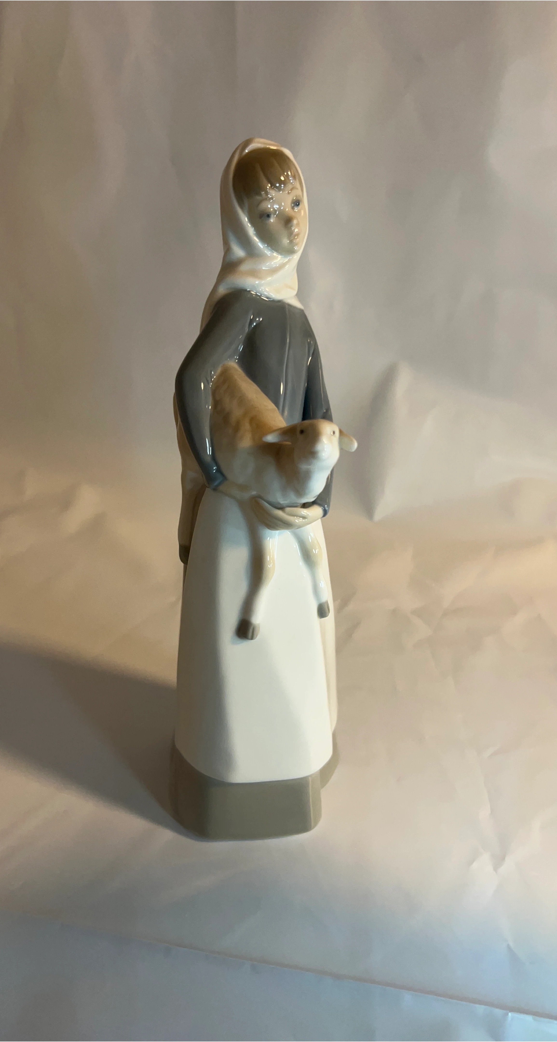 This is a beautiful Lladro figurine of a girl holding a lamb. It's in great condition and would make a lovely addition to any collection