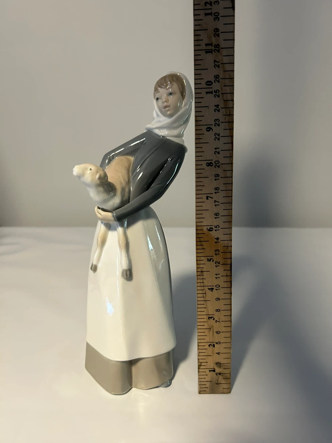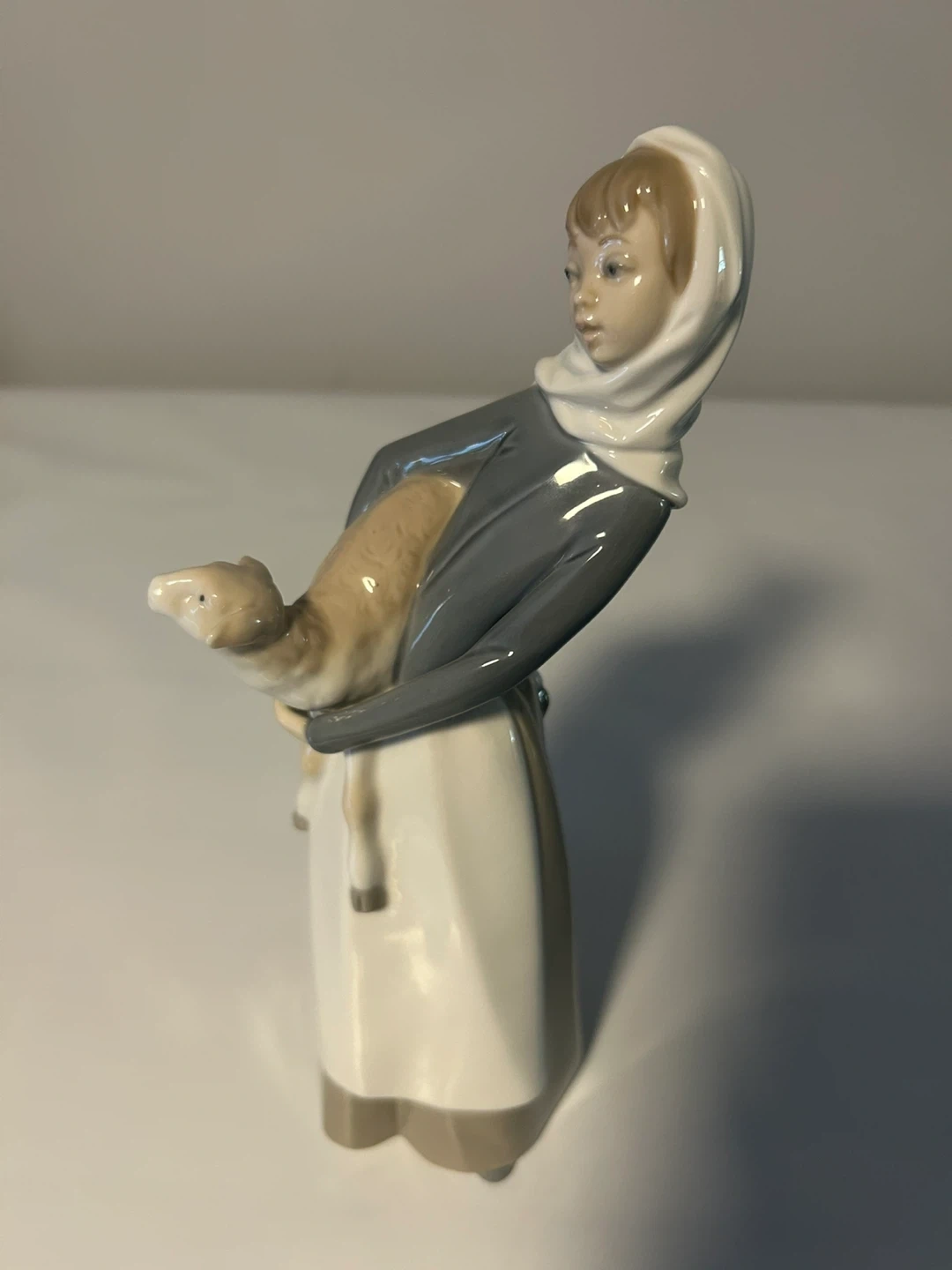 This is a beautiful Lladro figurine of a girl holding a lamb. It's in great condition and would make a lovely addition to any collection