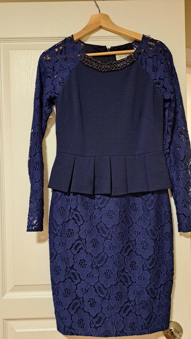 Selling a beautiful navy blue lace dress from LM Collection. It's a size 4 and features lovely lace detailing on the sleeves and skirt. Perfect for a special occasion or a night out!
