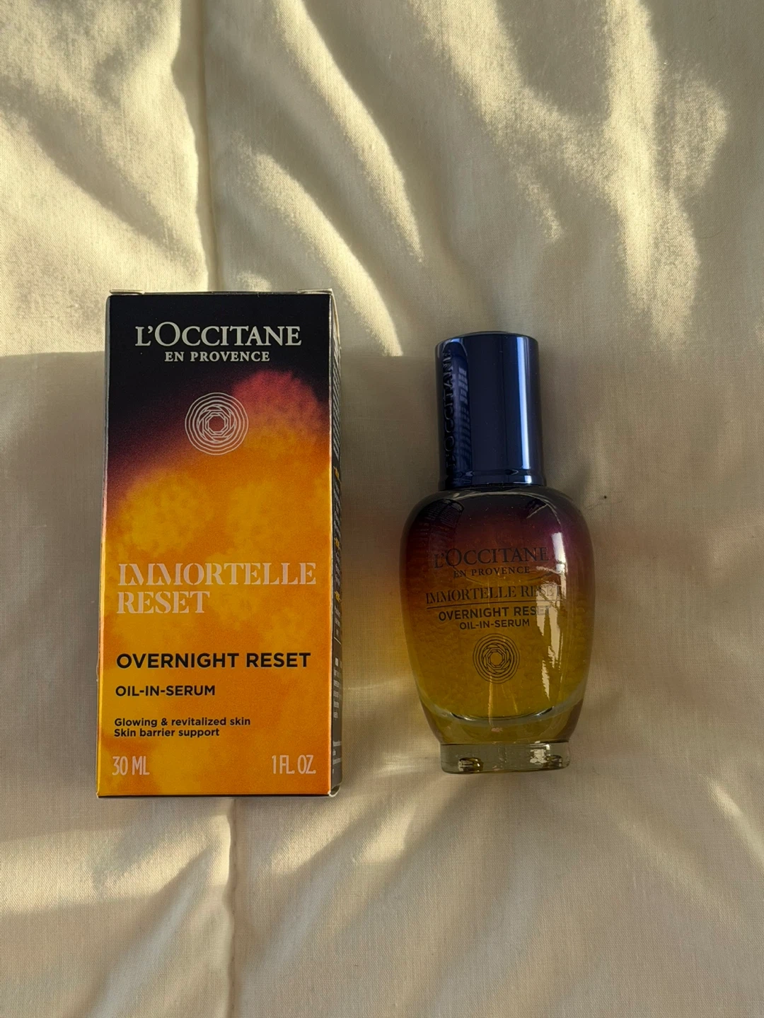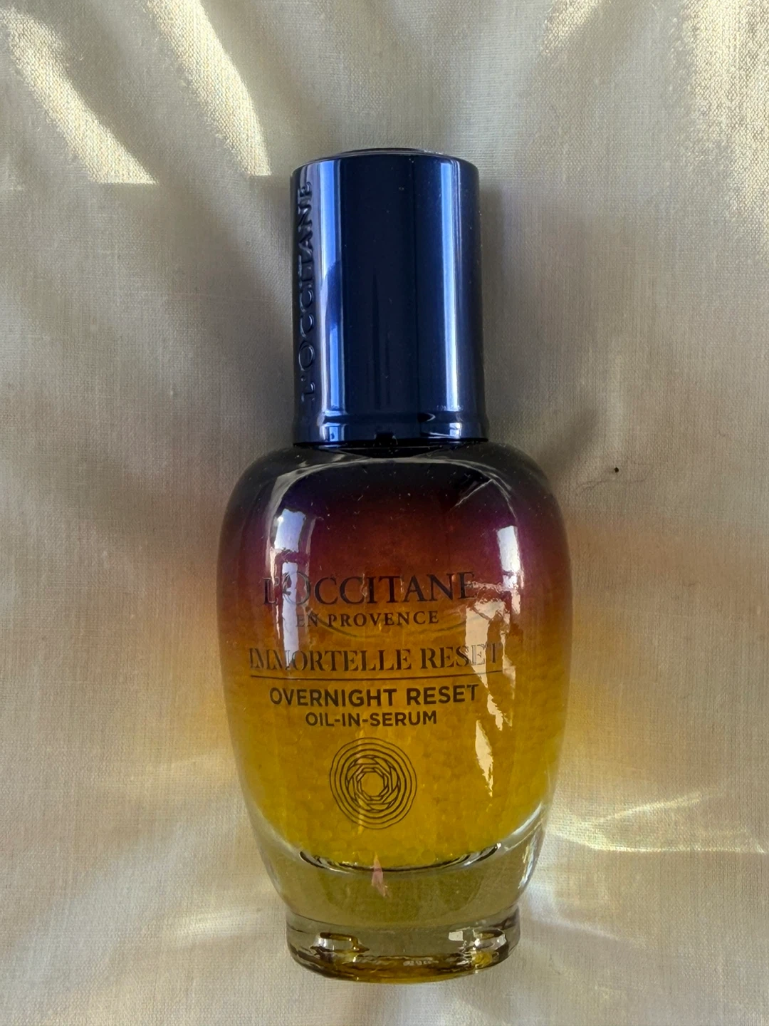 I'm selling a L'Occitane Immortelle Reset Overnight Reset Oil-In-Serum. It's designed to provide glowing and revitalized skin while supporting the skin's barrier function. This serum comes in a 30 mL (1 fl oz) bottle. Perfect for your nighttime skincare routine