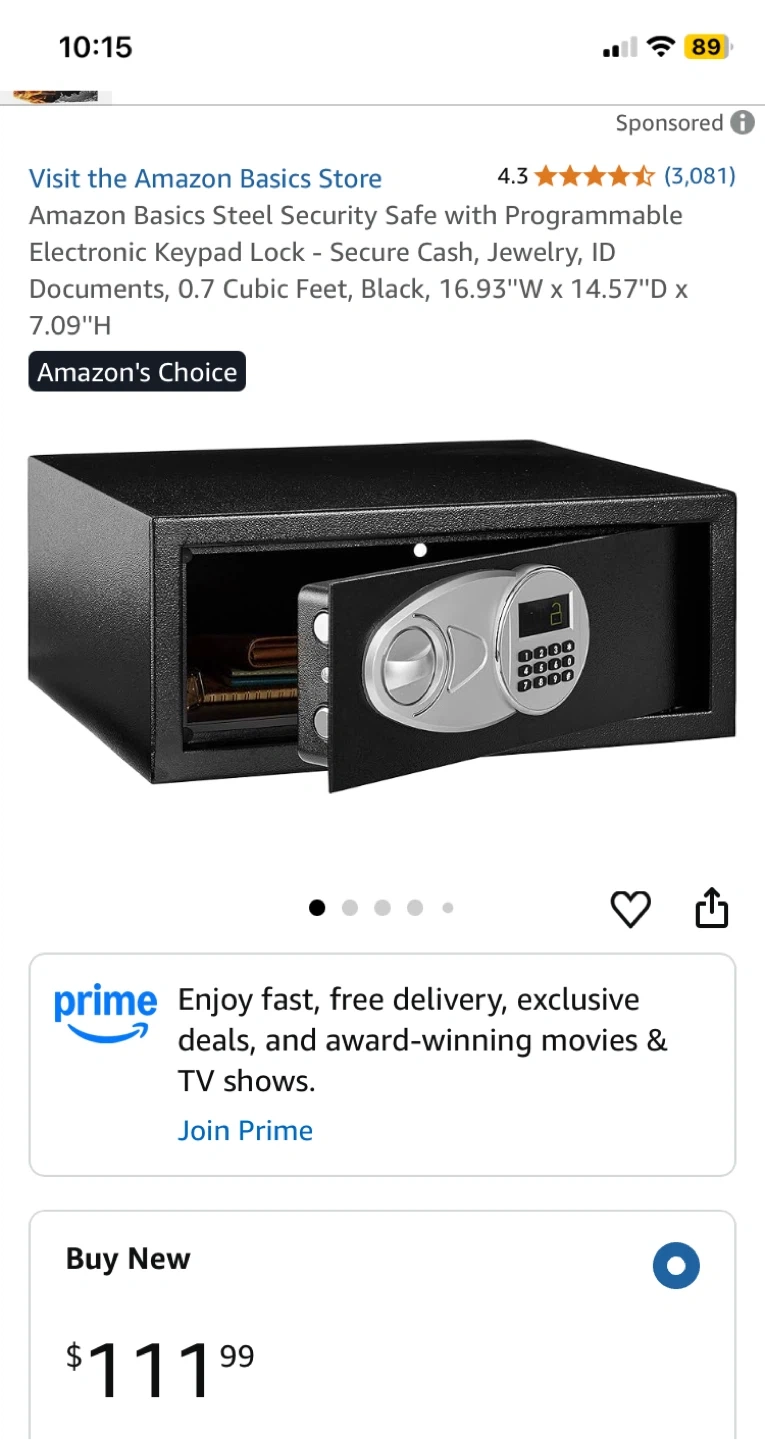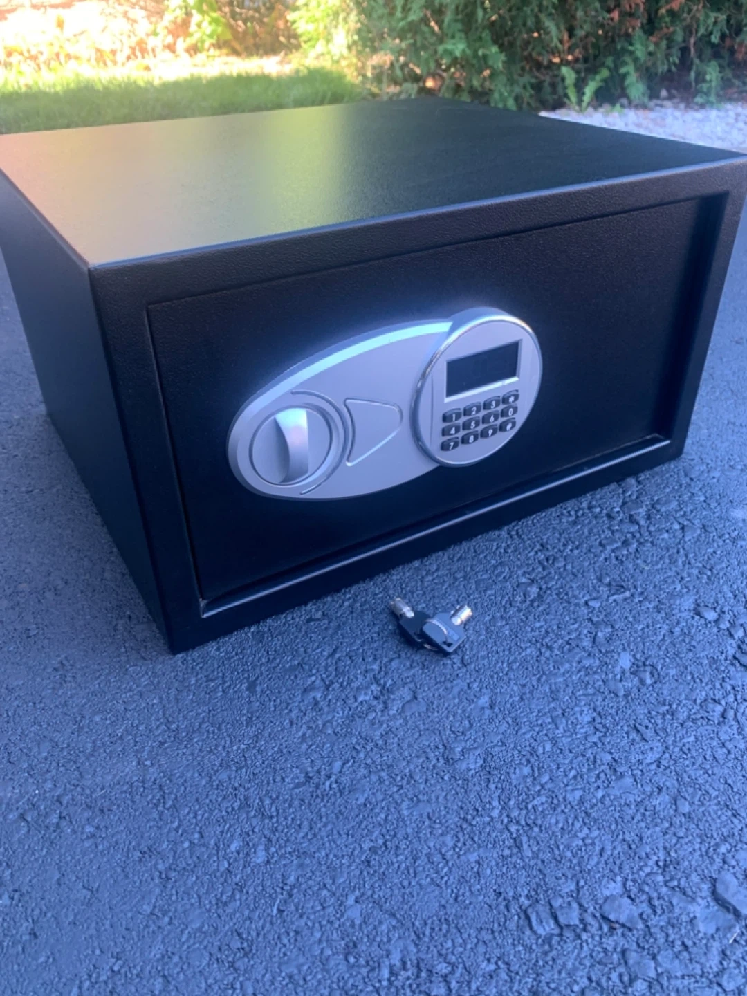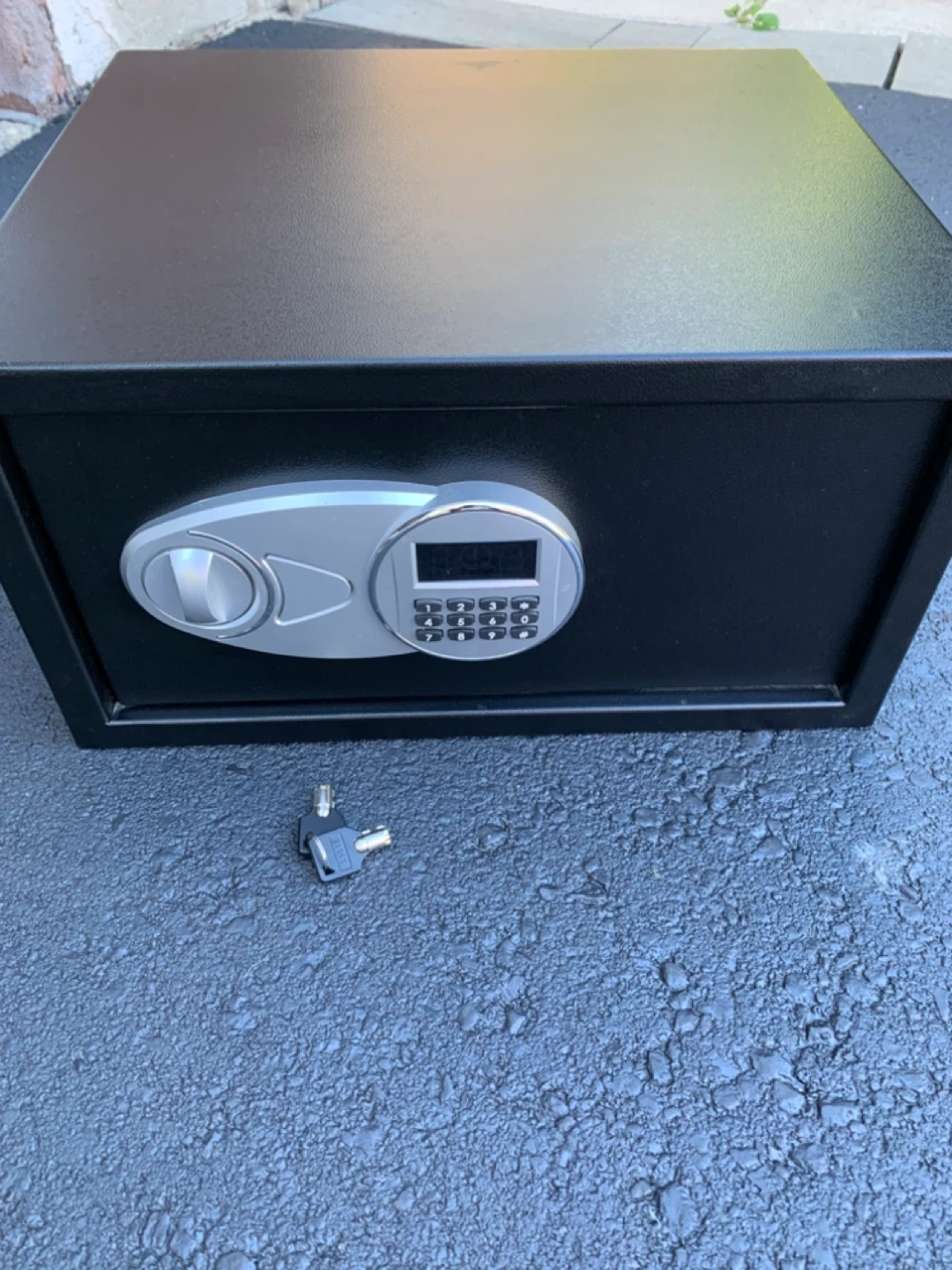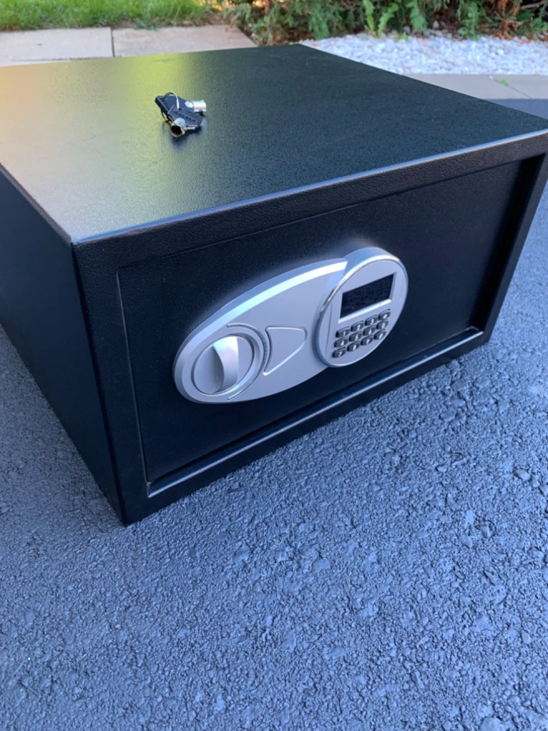 Lockable safe with backup keys Cost $125 and in new like condition. Asking only $60 Steel Security Safe with Programmable Electronic Keypad Lock Secure Cash, Jewelry, ID Documents, 0.7 Cubic Feet, Black, 16.93''W x 14.57''D x 7.09''H
