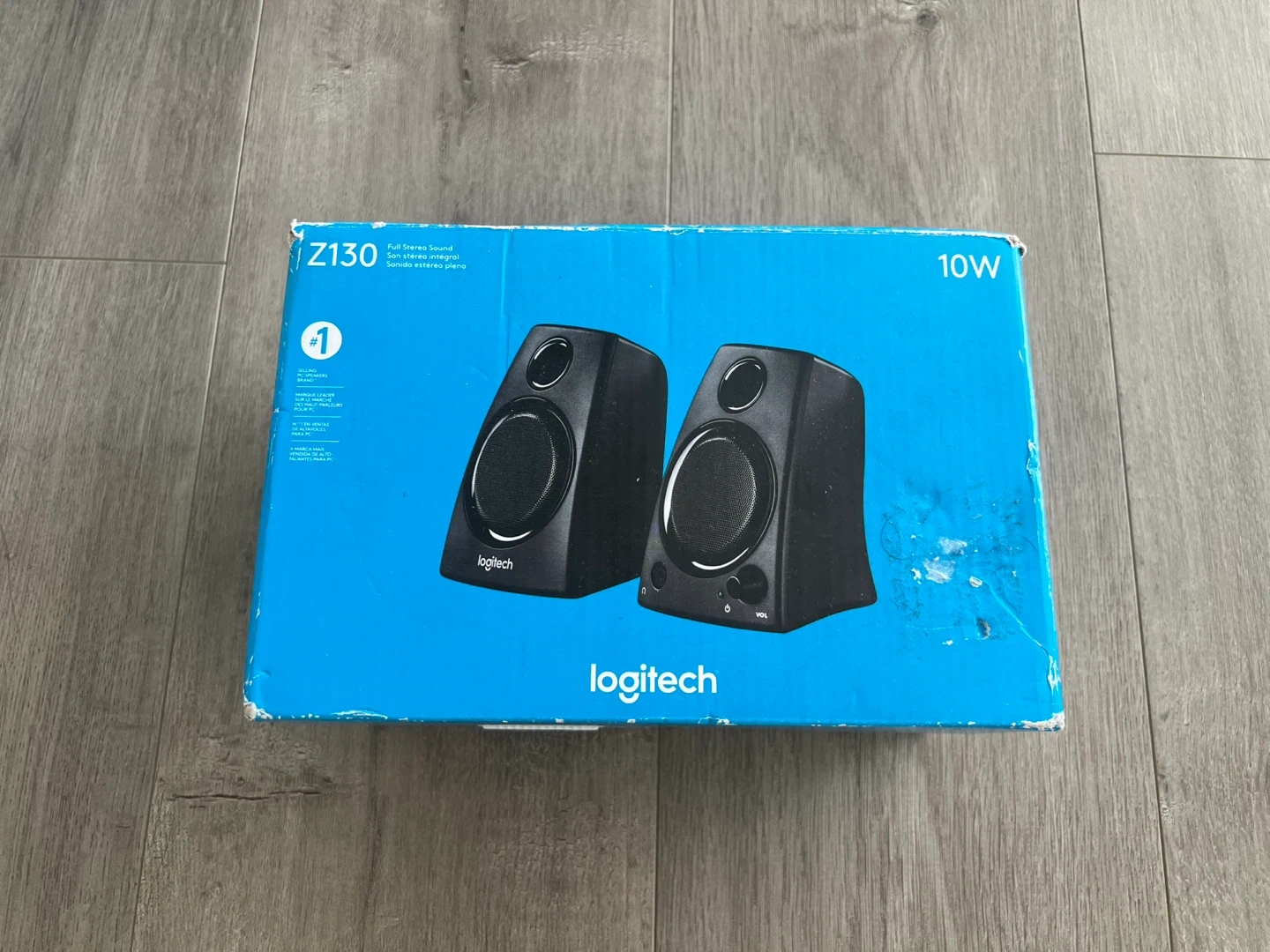 Selling a set of Logitech Z130 speakers! They deliver clear stereo sound with strong bass. - Full Stereo Sound - 10W Peak power - Easy access power, volume and headphone jack on the right speaker Comes with the original box and power supply