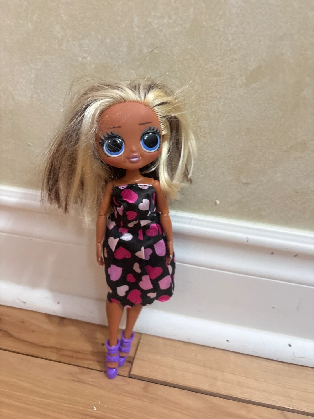 Selling a LOL OMG doll. She's wearing a cute black dress with pink and white hearts and matching purple heels. She's in good condition and ready for a new home!