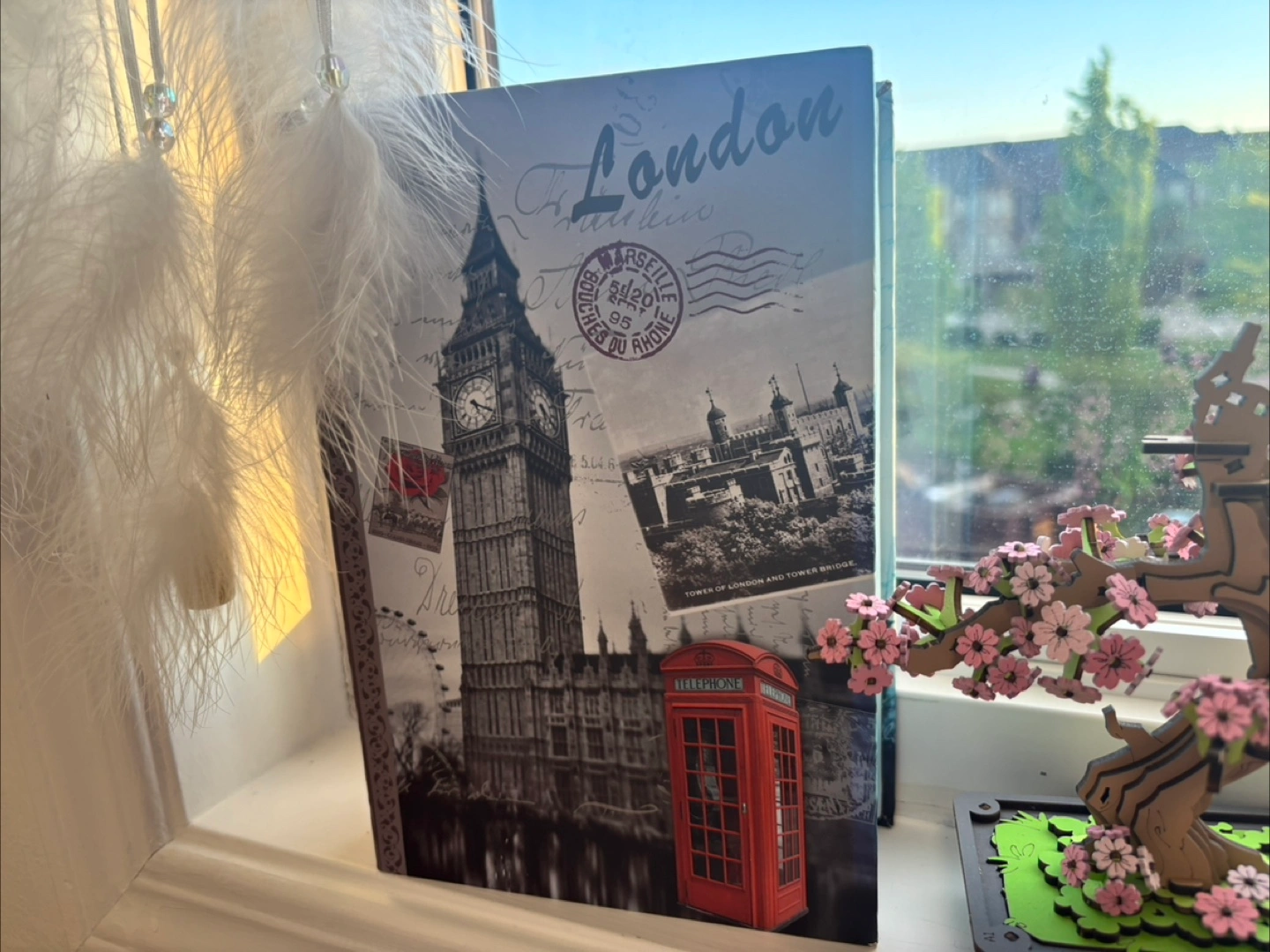 Unique decorative book-shaped box. Features London imagery, including Big Ben, Tower Bridge, and a red telephone booth. Light blue spine. Perfect for storing small items or as a decorative accent. Got it for $5