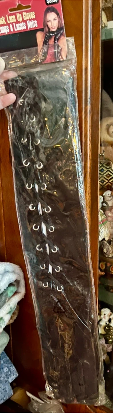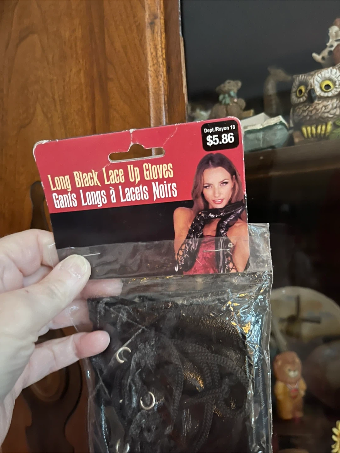 Selling a pair of long black lace-up gloves, still in the original packaging! They're new and ready for Halloween or dress up