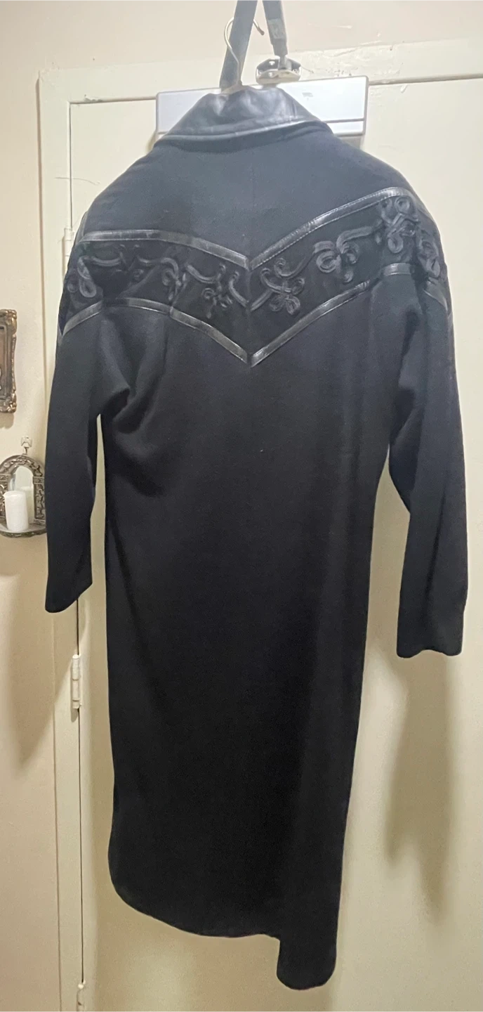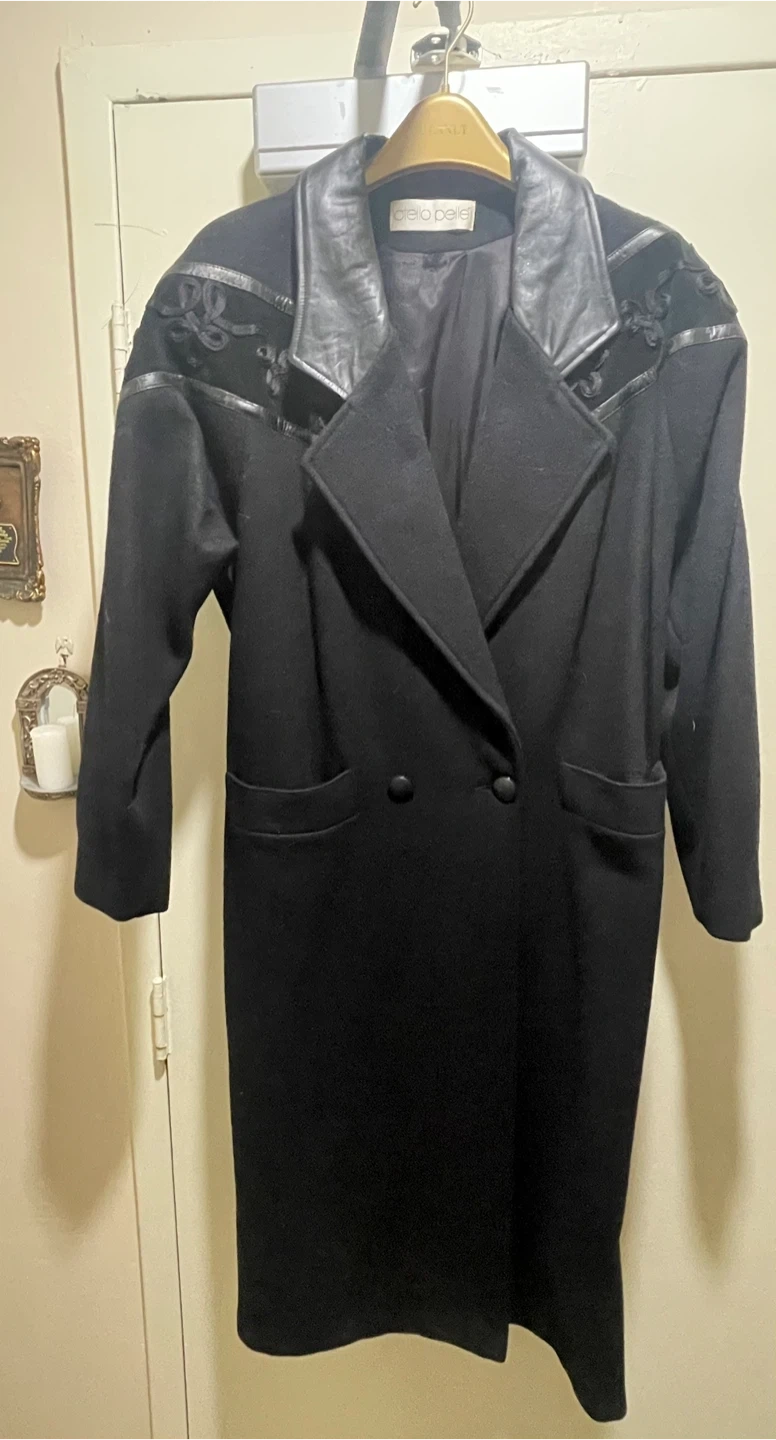This coat is a stylish addition to any wardrobe! It's a wool blend in classic black. The coat features a unique design with leather detailing on the collar and shoulders. Perfect for adding a touch of elegance to your look. Check other listings :)