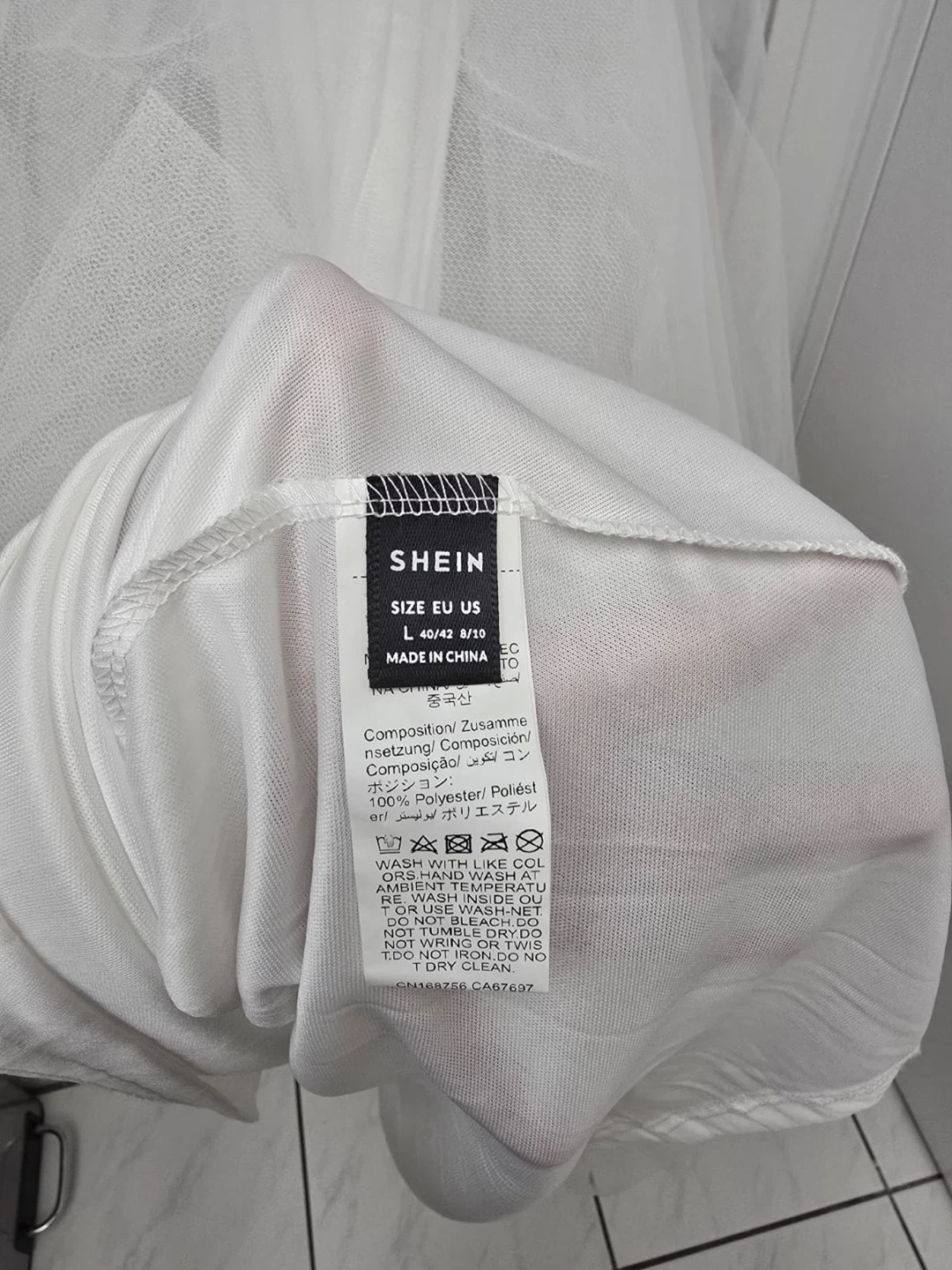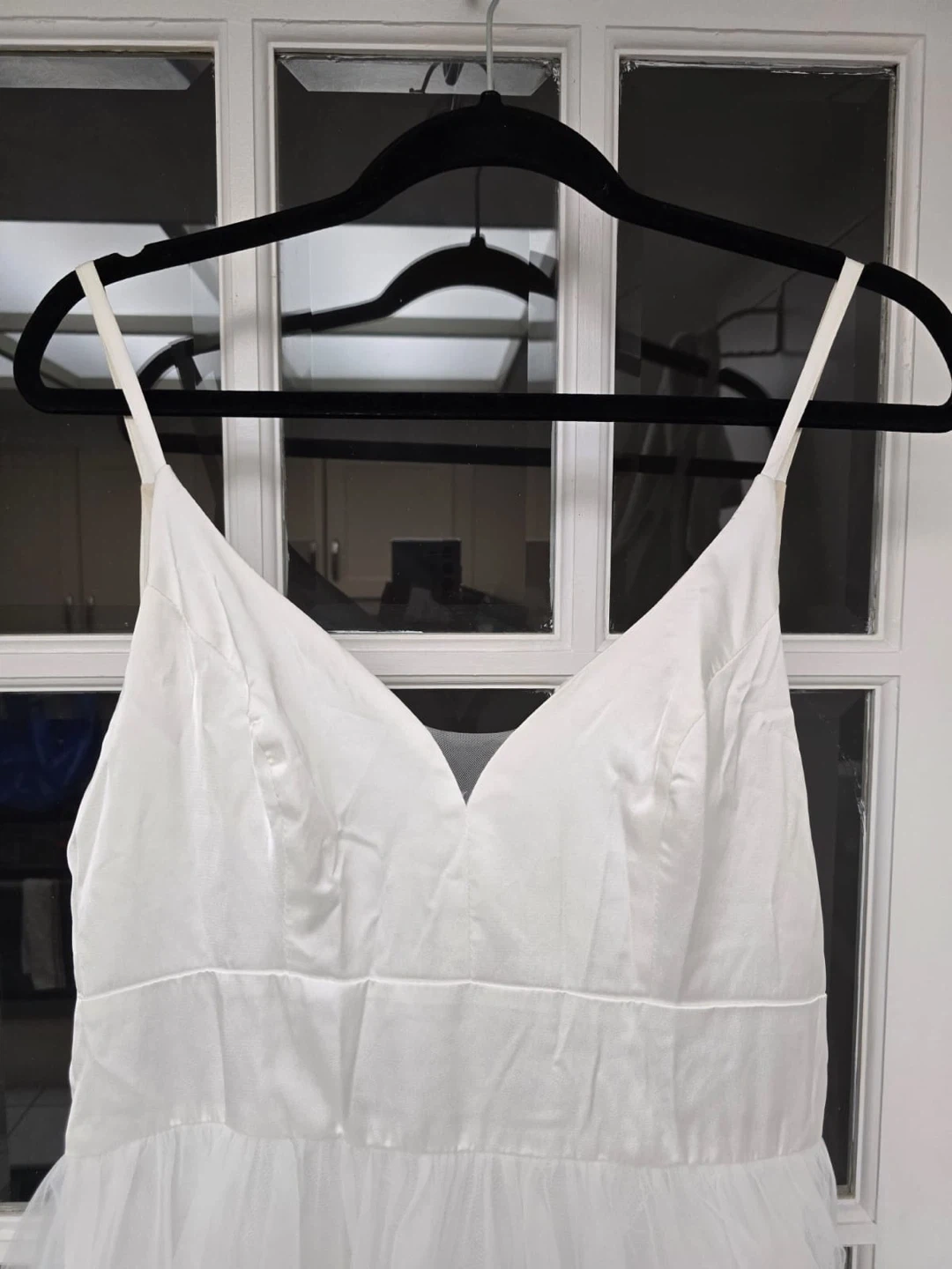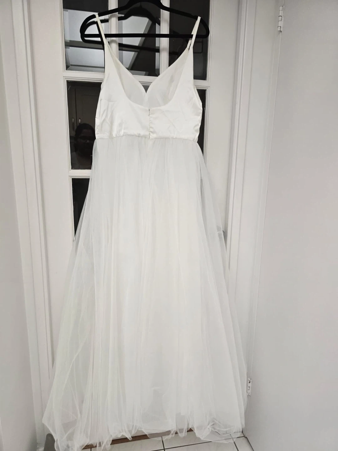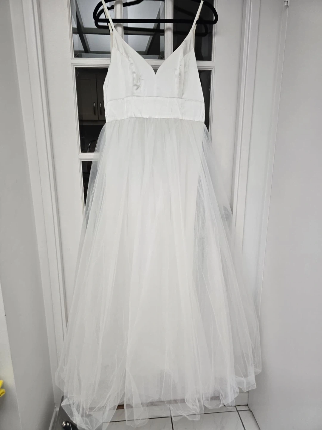 SHEIN Wedding Dress Size L or US 8/10 Didn’t get to wear this for my wedding because it was too tight and couldn’t return. Bust has no padding and it is deep cut / low neck. The back has a zip. Floor length. Please visit this link to the SHEIN website to view more details http://api-shein.shein.com/h5/sharejump/appjump?link=l5tFs4MLPHd_8_1&localcountry=CA&url_from=GM74994446470 Pick up only!!