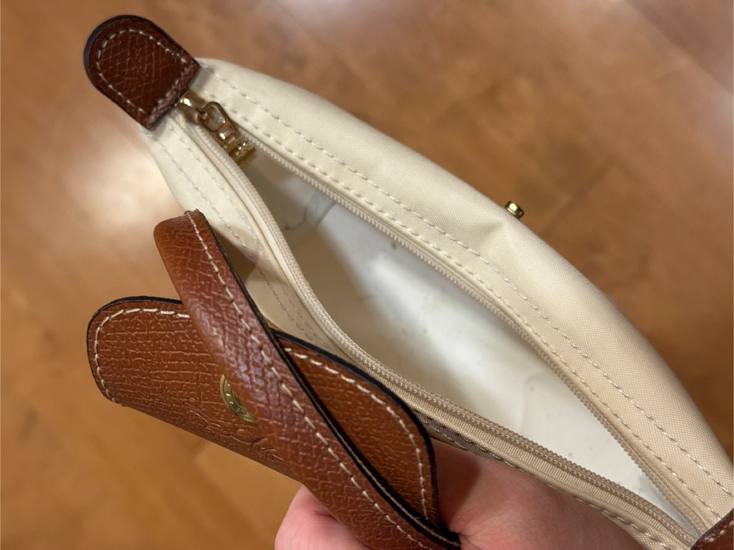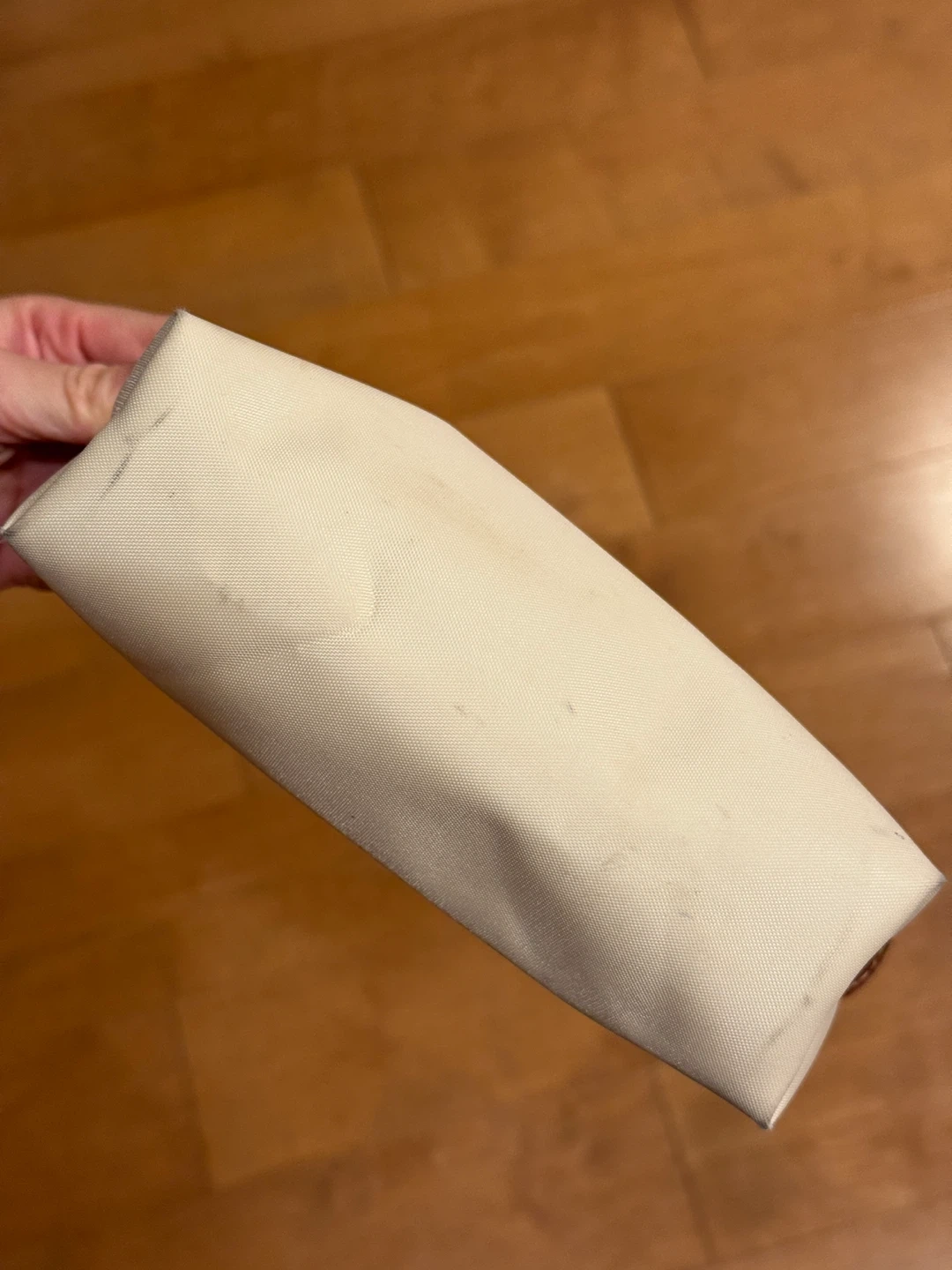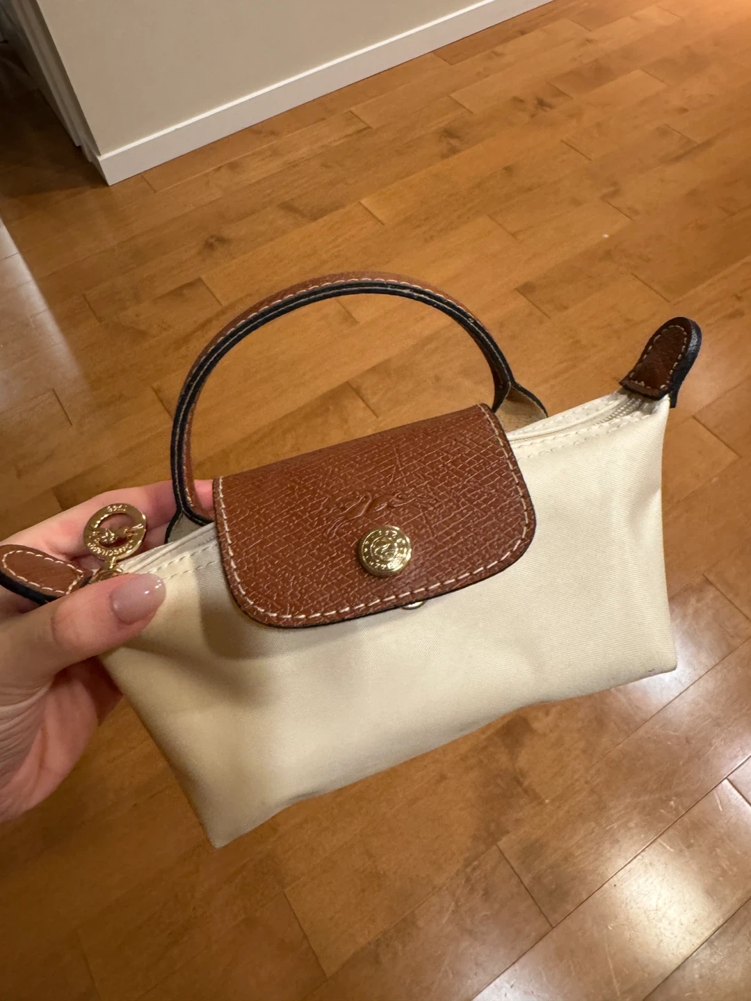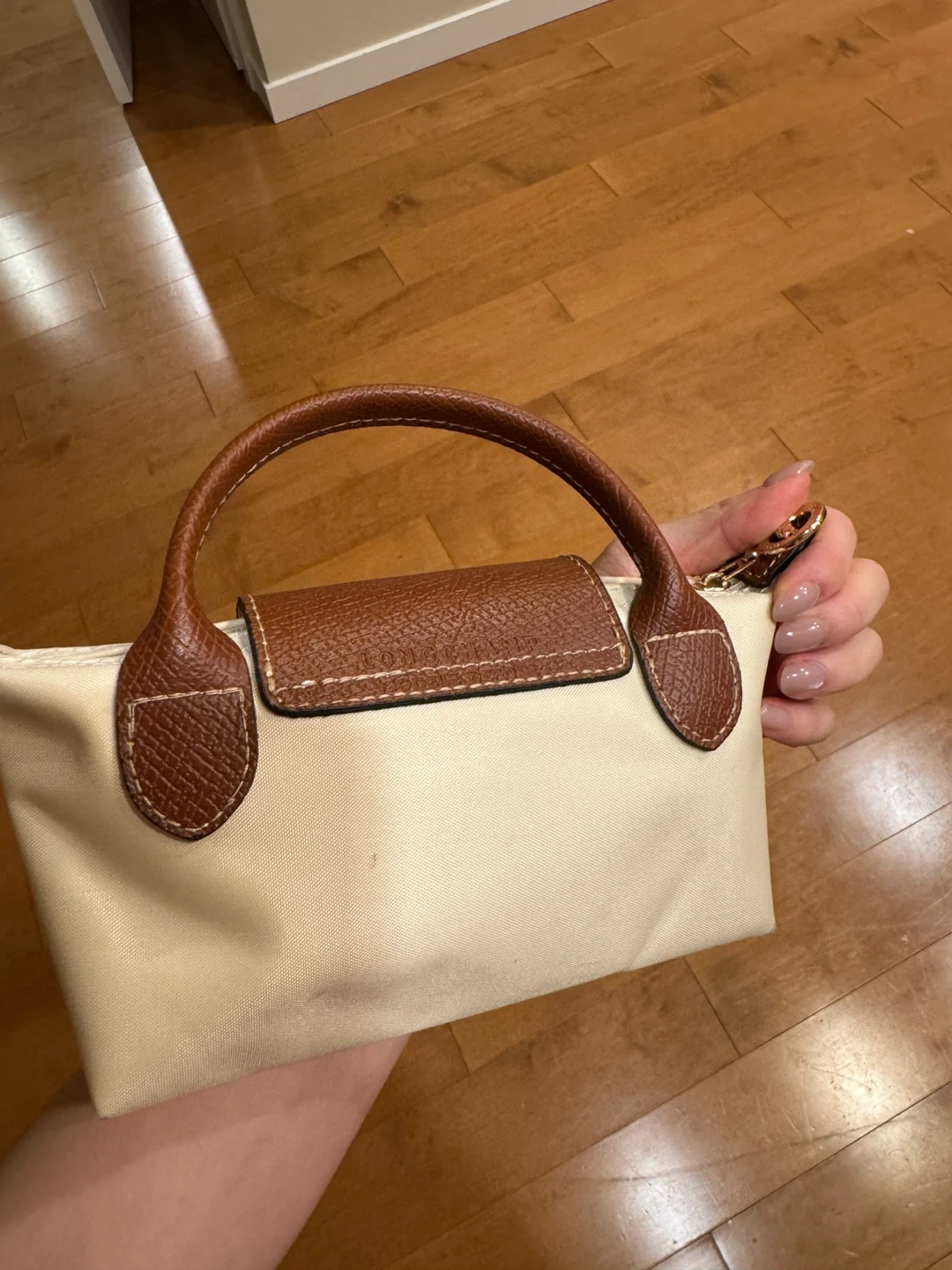 a Longchamp Le Pliage mini top handle bag! It's in a cream colour with brown leather accents. It has some signs of use. Pick Up only at UBC Wesbrook Village or Vancouver City Station