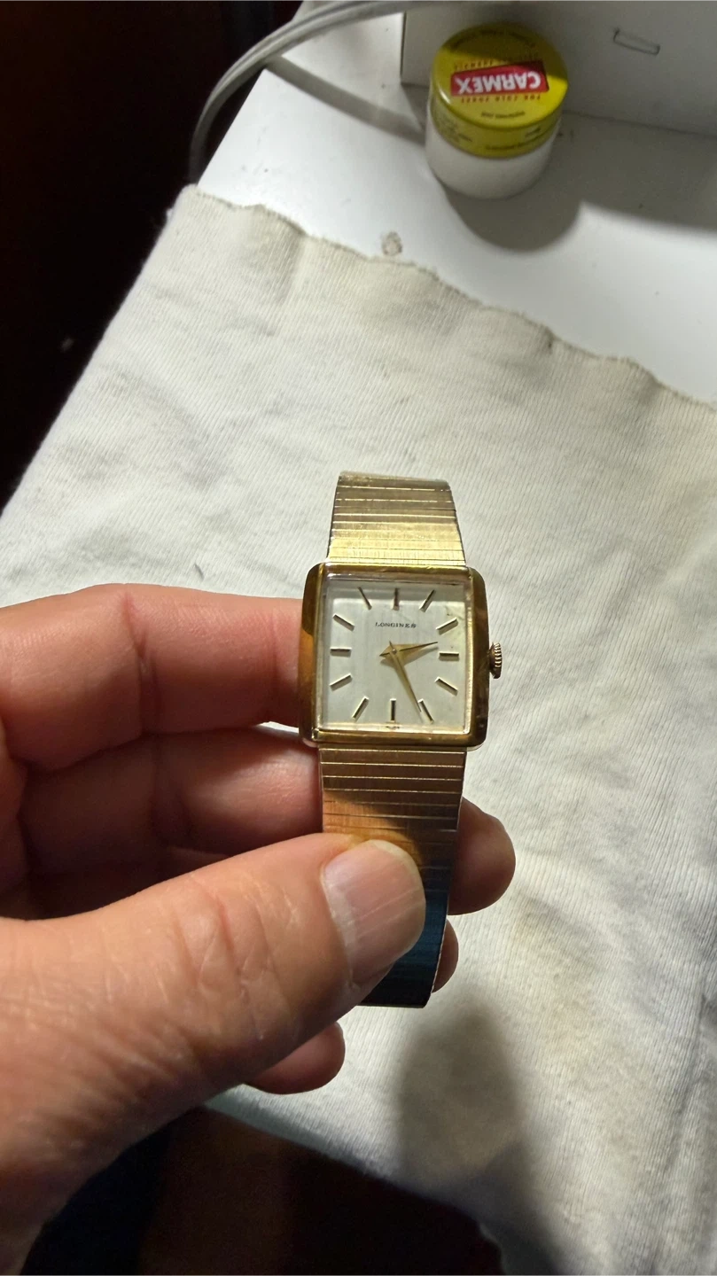 Selling a Longines ladies self winding watch with a gold-tone finish. It's a classic piece that would make a lovely addition to any collection. The watch has a square face and a mesh band. Still running well