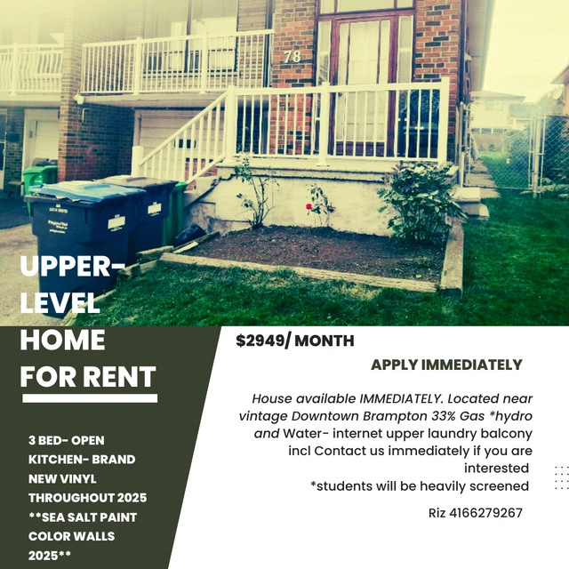 ****AVAILABLE IMMEDIATELY****NEW SEA SALT 2025 COLOR PAINT THROUGHOUT! NEW VINYL FLOORING 2025 THROUGHOUT! Great for quiet clean professionals or small families this sought after area with balcony- available Upper Level spacious 10 feet ceiling “updated bathroom flooring kitchen cabinets entry” kitchen upper level with laundry apartment in Vodden Downtown Brampton area available. Close to Restaurants Bus stops gym strip mall. $2949/ month first and last WIFI and Laundry included 33%gas 33% water 33%HYDRO can be negotiated. NO Smoking policy. This property is managed and overseen often. References and or checks relevant for ideal candidate maybe required. Quiet clean Small families couples professionals preferred! Call for further details. Riz 4166279267