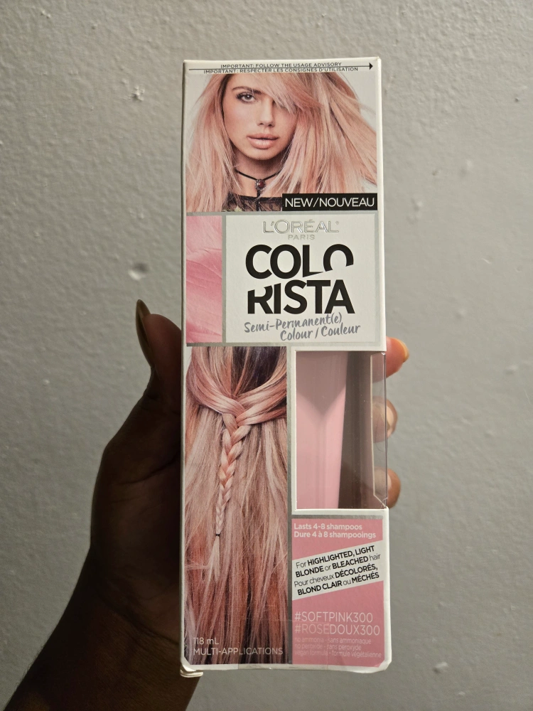 New L'Oréal Paris Colorista hair colour. Soft Pink shade 300. Semi-permanent. Lasts 4-8 shampoos. Suitable for highlighted, light blonde and bleached hair. Multi-applications✨️👩🦱👋🏾💃🏾 CURBSIDE PICK UP ONLY..✨️👋🏾