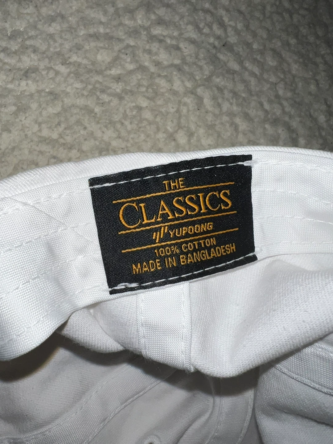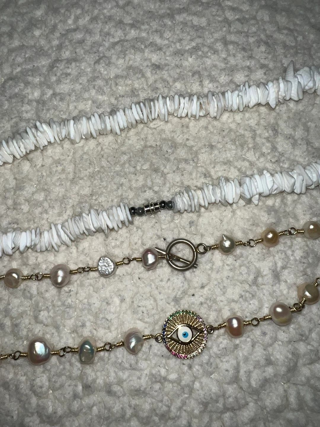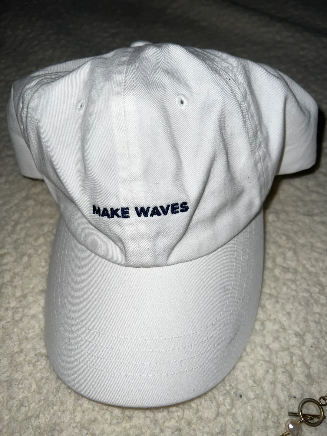 Selling a white baseball cap from The Classics Yupoong! It has 'MAKE WAVES' embroidered on the back. It's made of 100% cotton. Jewelry are made in the Philippines, real pearl necklace and a shell necklace