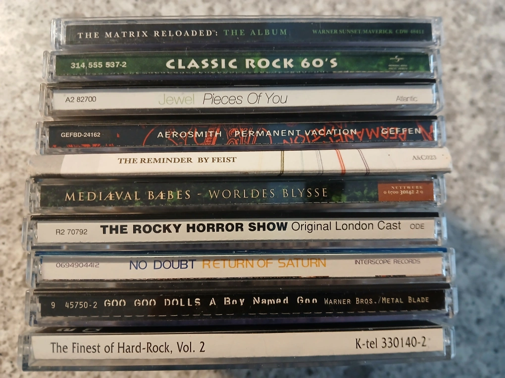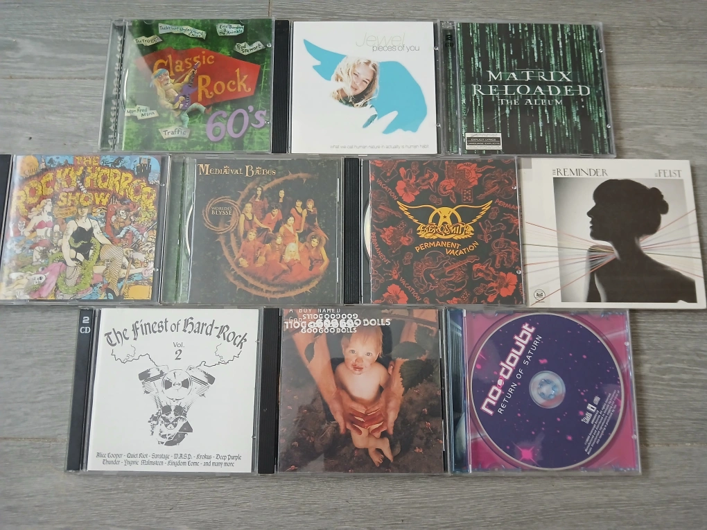 *Cash and pick up ONLY at location shown on ad. *NO trades. Non-negotiable. Collection of 10 pre-owned CDs. Genres include rock, pop, and musical theatre. Artists include Aerosmith, Feist, No Doubt, and more. Various record labels represented.