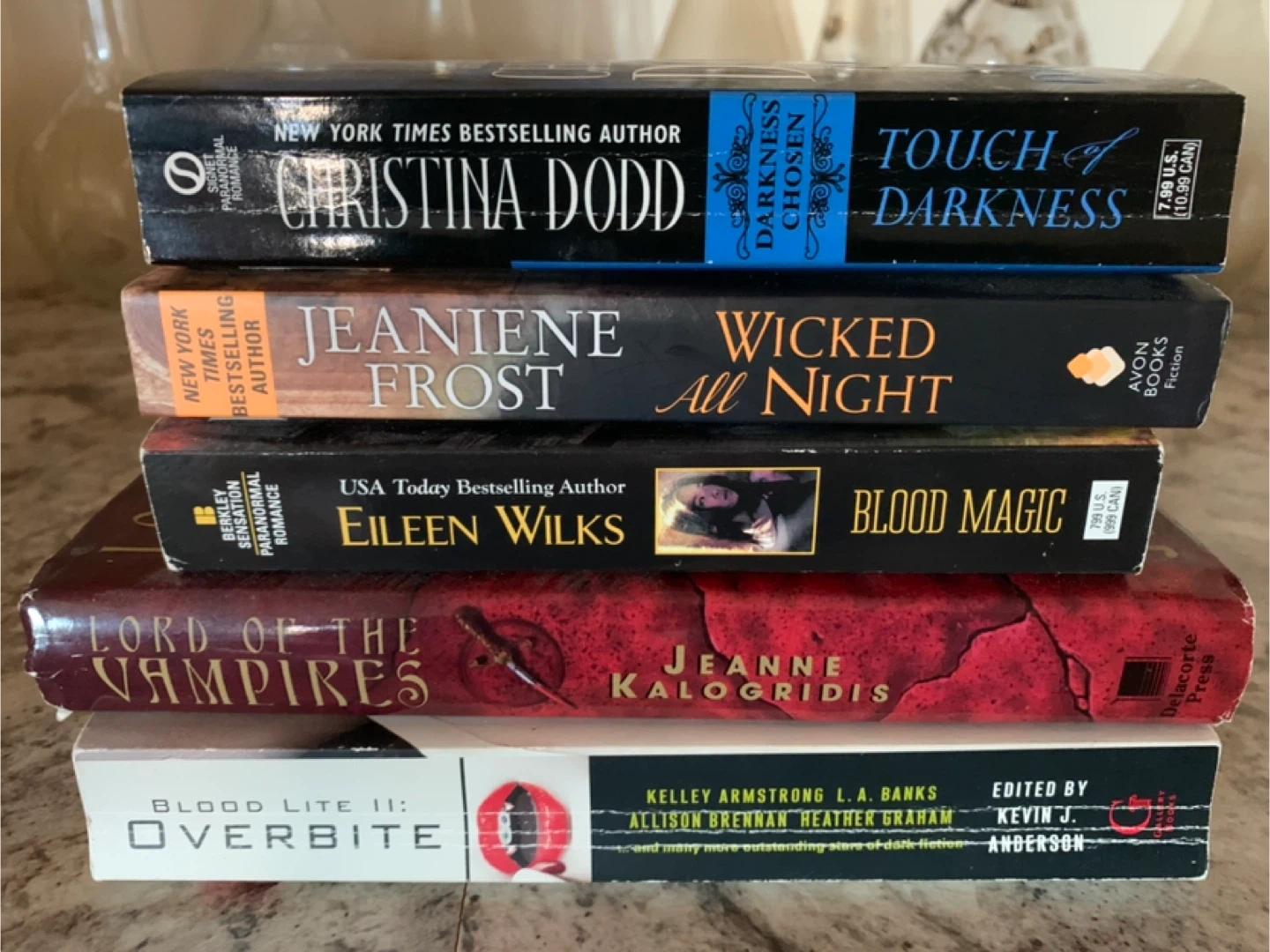 Selling a lot of five paranormal romance books! Titles include: - Touch of Darkness by Christina Dodd - Wicked All Night by Jeaniene Frost - Blood Magic by Eileen Wilks - Lord of the Vampires by Jeanne Kalogridis - Blood Lite II: Overbite by Kelley Armstrong, L.A. Banks, et al