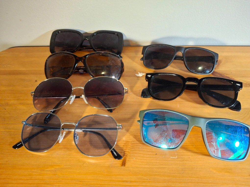 Selling a lot of six pairs of sunglasses! There's a variety of styles, from classic black frames to trendy round ones and even a pair with a cool blue tint. Great for adding some variety to your eyewear collection