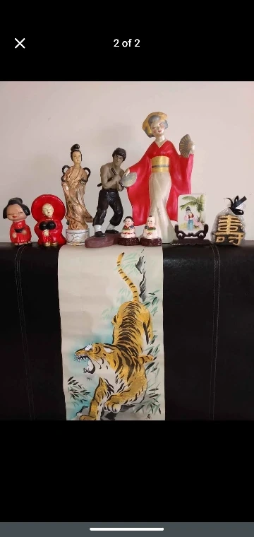 Bruce Lee ornament Wall scroll Chak Ware ornaments Japanese and Chinese ornaments Japanese chalkware ornament The red and black colors are still extremely vibrant! 5" tall x 3" wide Assuming it was made in the '60s to '70s Dancing Geisha Fan Girl 12.5" TALL! Vintage 70s TALL Japanese Geisha Fan Dancer Figure. She's Wearing a Gorgeous Red Dress With Gold Accents. 12.5" Tall x 6.5" Wide Tan ceramic woman figurine Both hands are broken off but still has one unattached hand And more! Get this entire lot for one low price! I've used Google lens and seen just one of these ornaments on Etsy is worth more than the price of this entire lot 💵