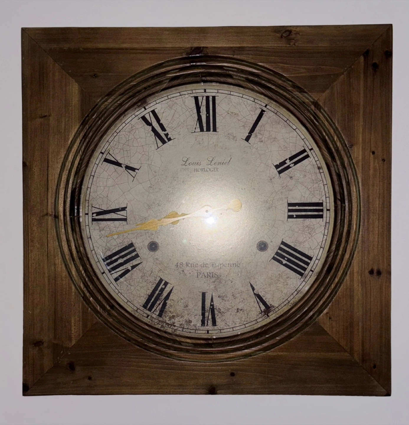 Features a rustic, distressed-look clock face. Roman numerals. Wooden frame. A clock like this would be an excellent addition to any room.