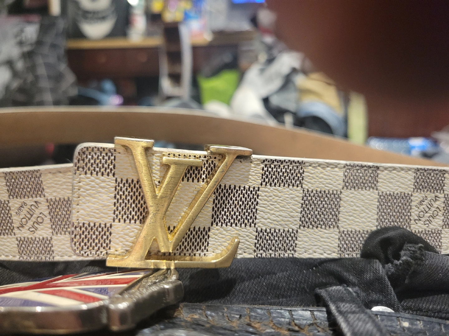 Selling a Louis Vuitton belt with the classic LV logo and checkered pattern. It's in good condition and ready for a new home!
