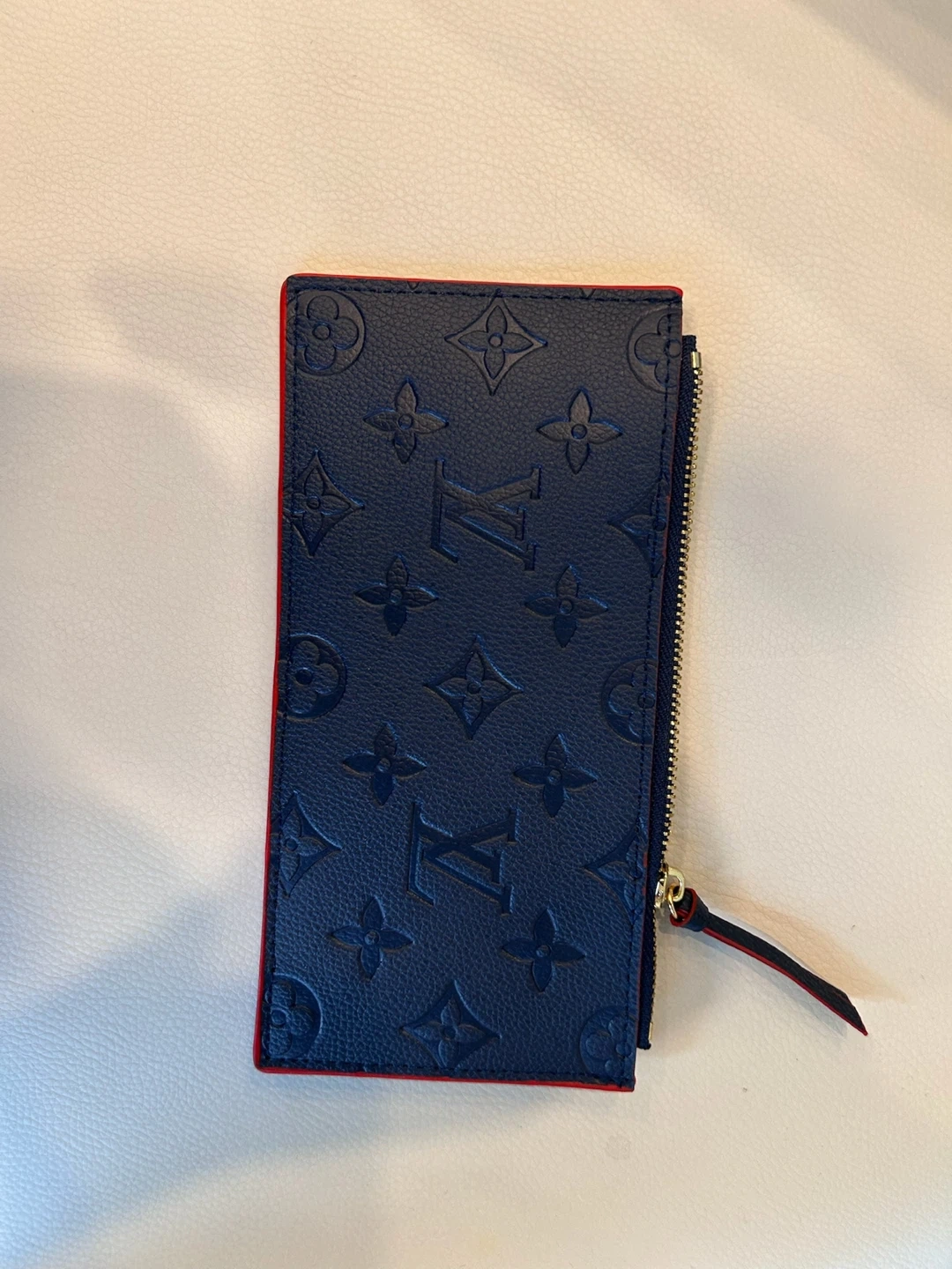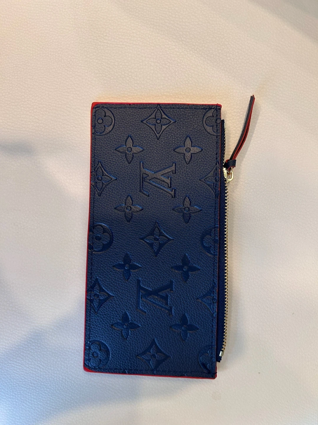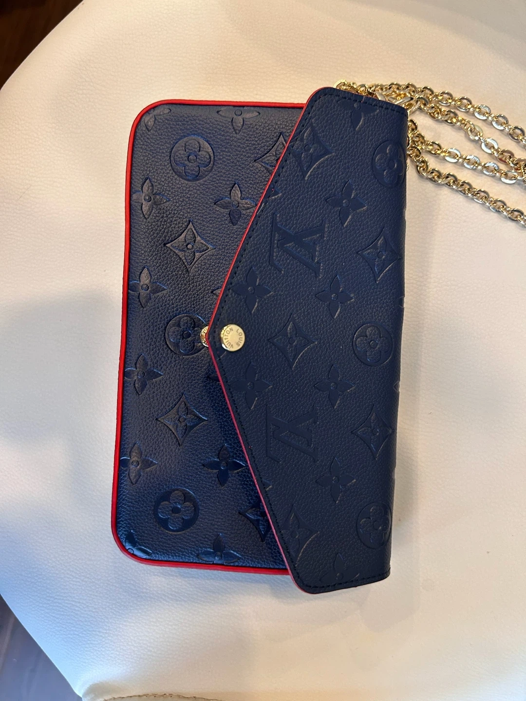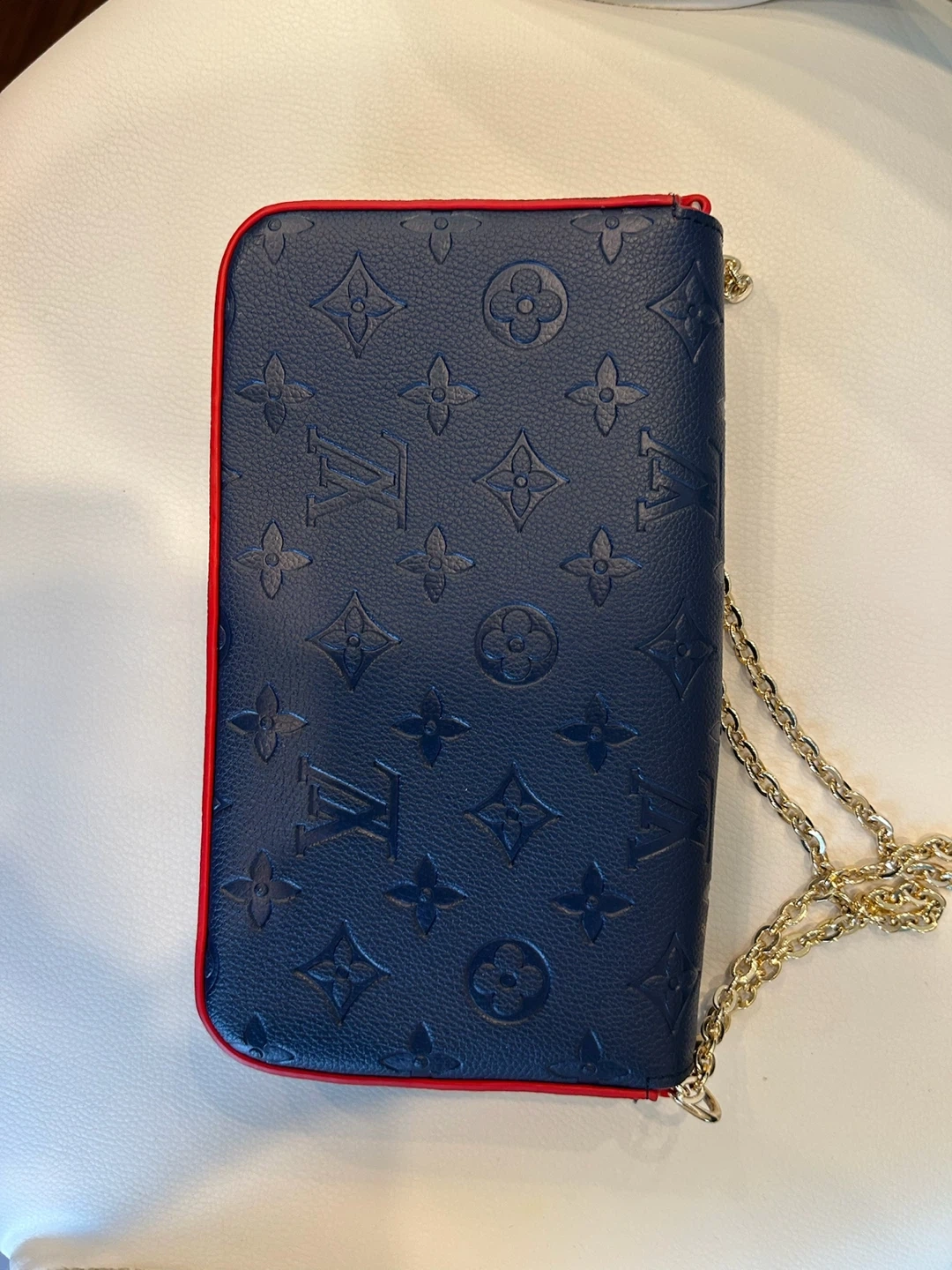 Selling a stylish Louis Vuitton wallet on a chain! The wallet is a beautiful blue colour with the classic LV monogram pattern. It has a red trim and a gold chain. Perfect for adding a touch of luxury to any outfit! Good Condition. Door Pickup Only off Barnet Highway. First Come First Serve. Won’t reply to lowballs.