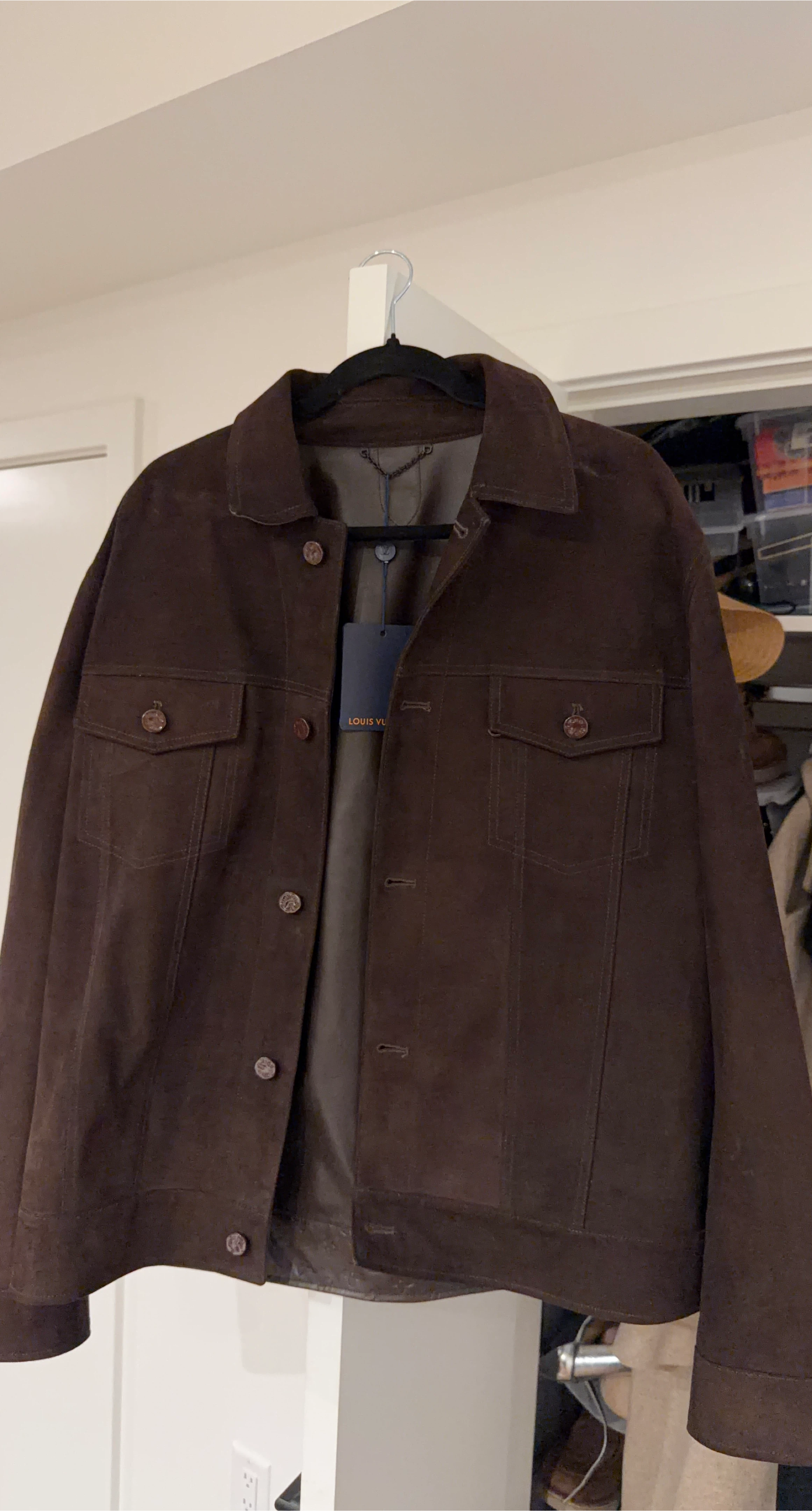 Here's a stylish Louis Vuitton brown suede jacket. It's in great condition and ready for a new home! The material is soft and luxurious, perfect for adding a touch of class to any outfit