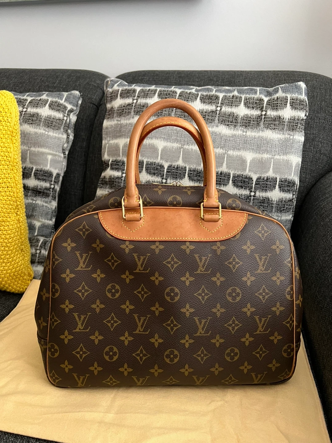 Selling a classic Louis Vuitton Deauville handbag in the iconic monogram canvas. It's in great shape and perfect for everyday use or travel. The interior is clean with multiple pockets for organization. The zipper has the LV logo on it. With dust bag. Some watermarks on leather and some tarnishing on zipper pull hardware.Otherwise in great shape.