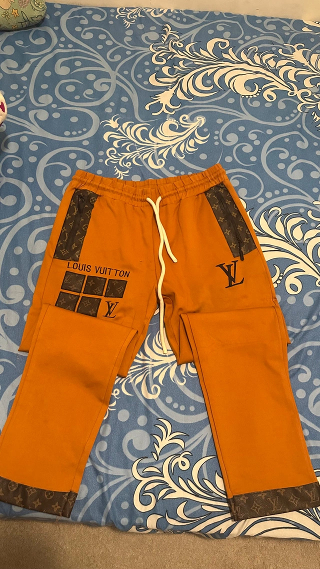 These Louis Vuitton pants feature a stylish design with logo detailing, perfect for casual wear. They are in good condition, showing minimal signs of wear, making them a fashionable and comfortable addition to your wardrobe. Specifications: * Brand: Louis Vuitton * Material: Cotton Blend * Size: M If the ad is up, they're available!
