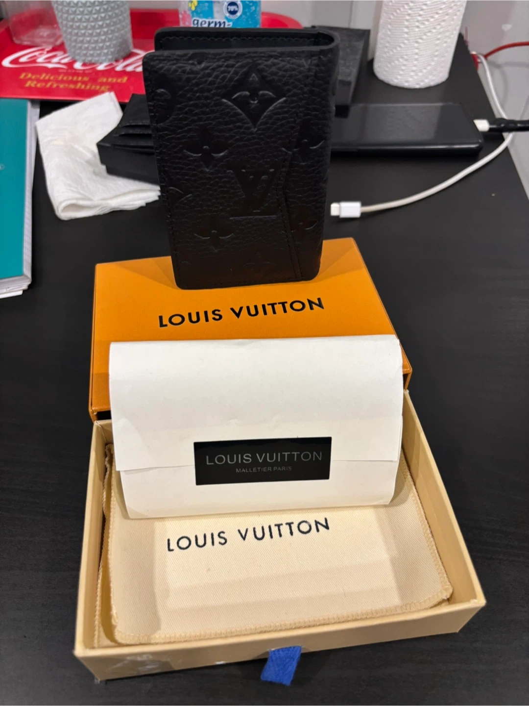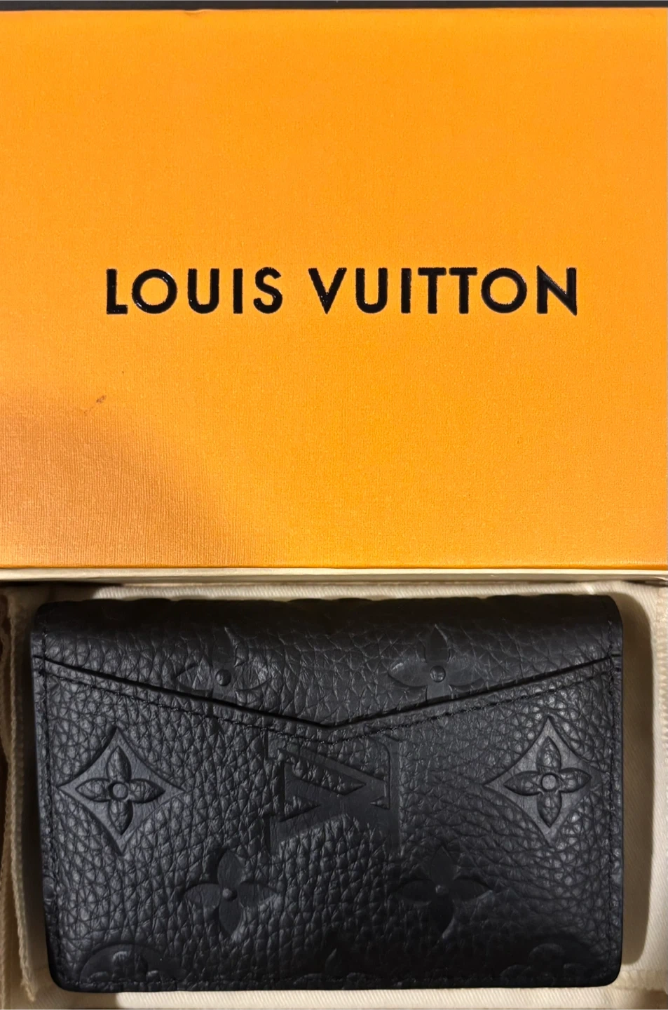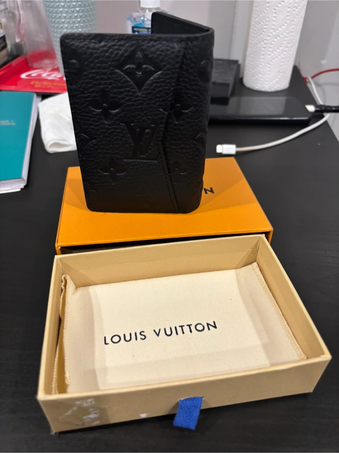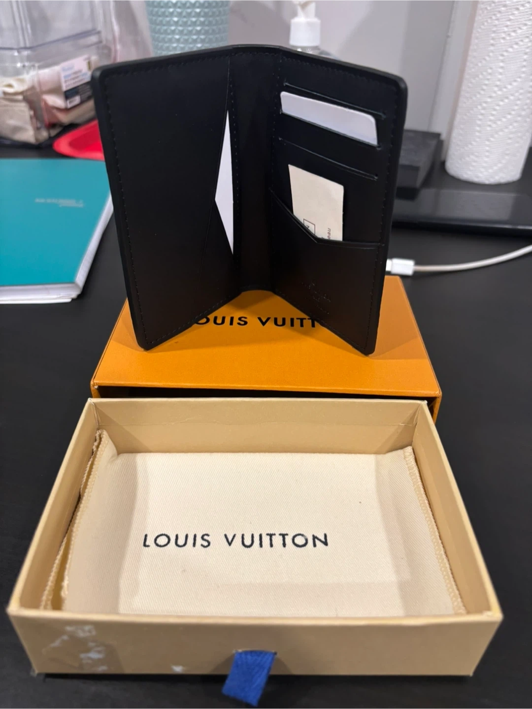 Selling a Louis Vuitton Pocket Organizer in black. It comes with its original box and dust bag. This stylish and compact wallet is perfect for keeping your cards and cash organized. Originally bought for $715