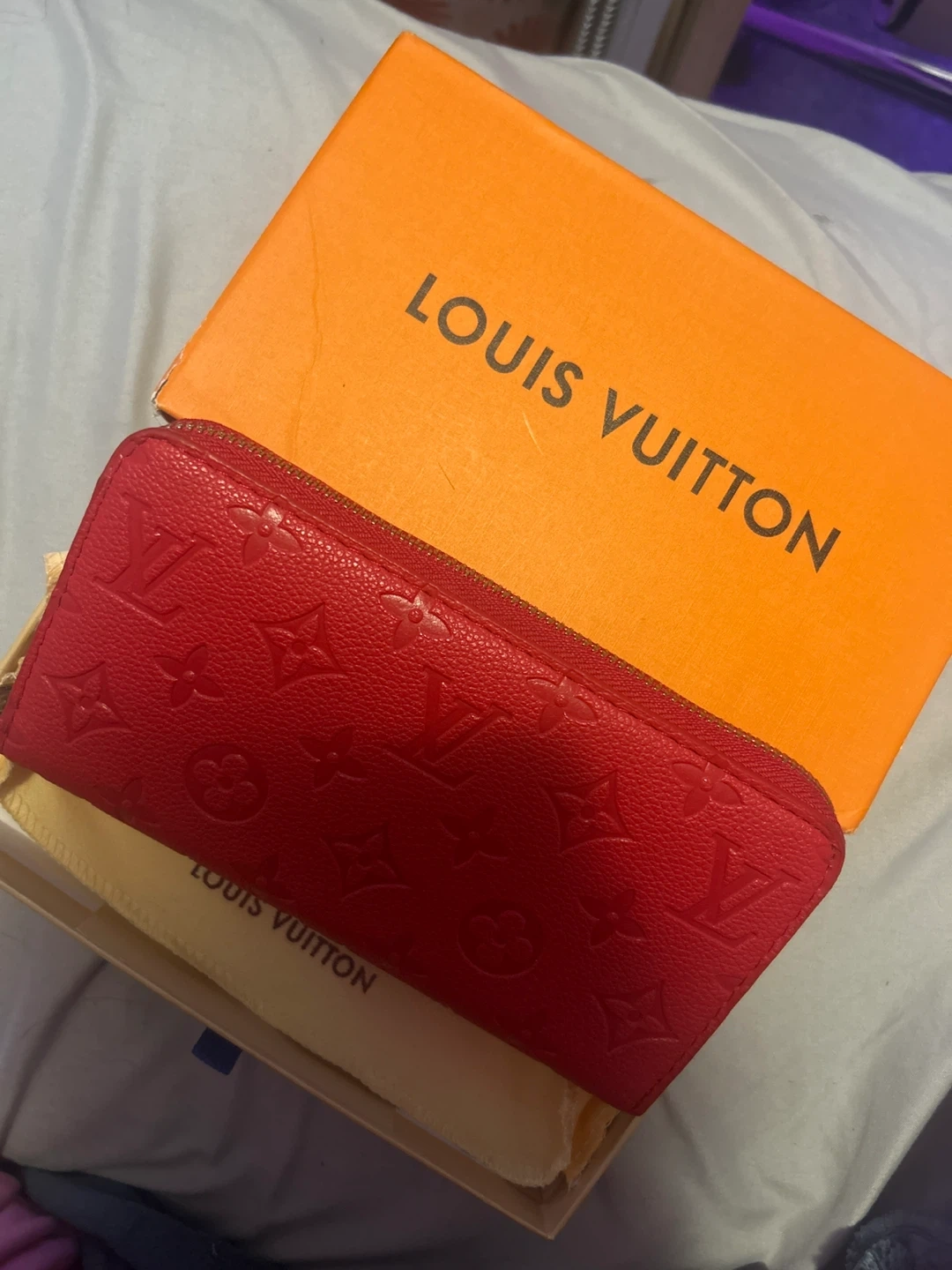 Selling a beautiful Louis Vuitton wallet in red leather! It comes with the original box and dust bag. The wallet features the iconic LV monogram pattern. Perfect for keeping your essentials organized in style
