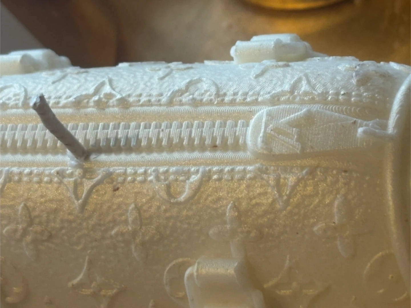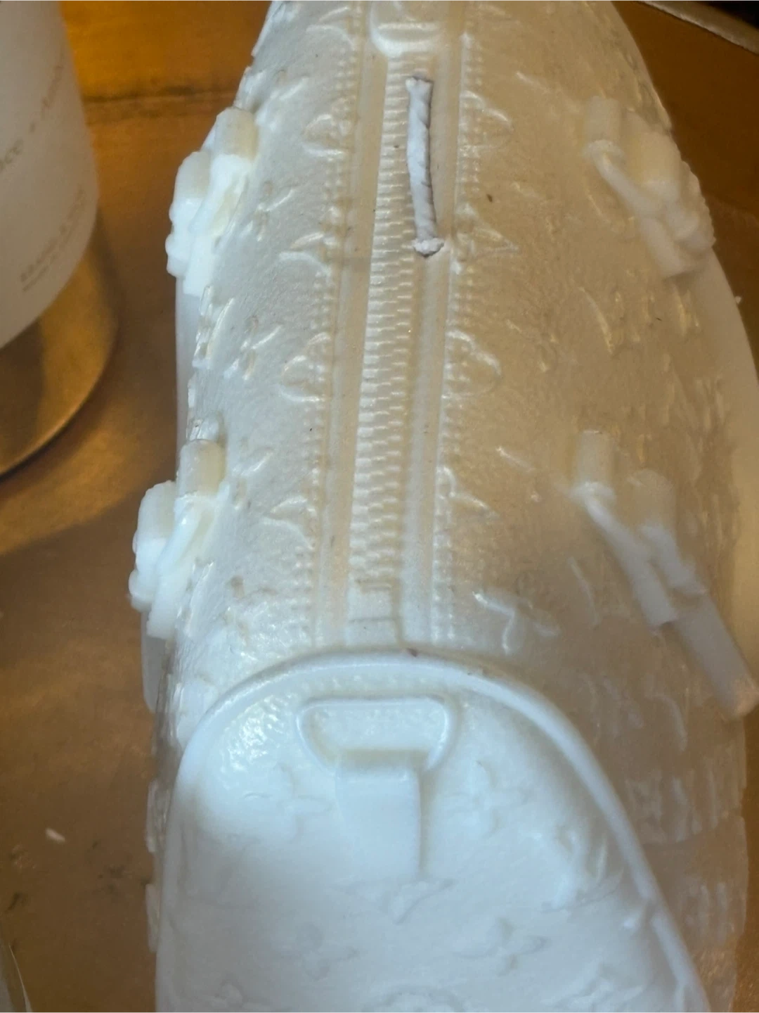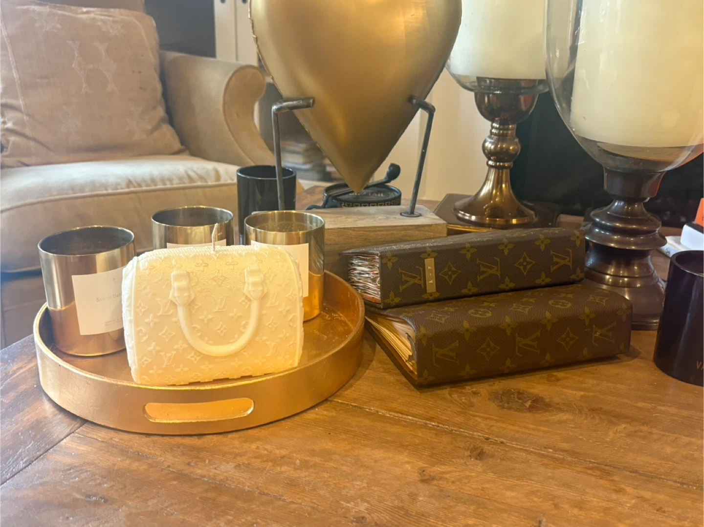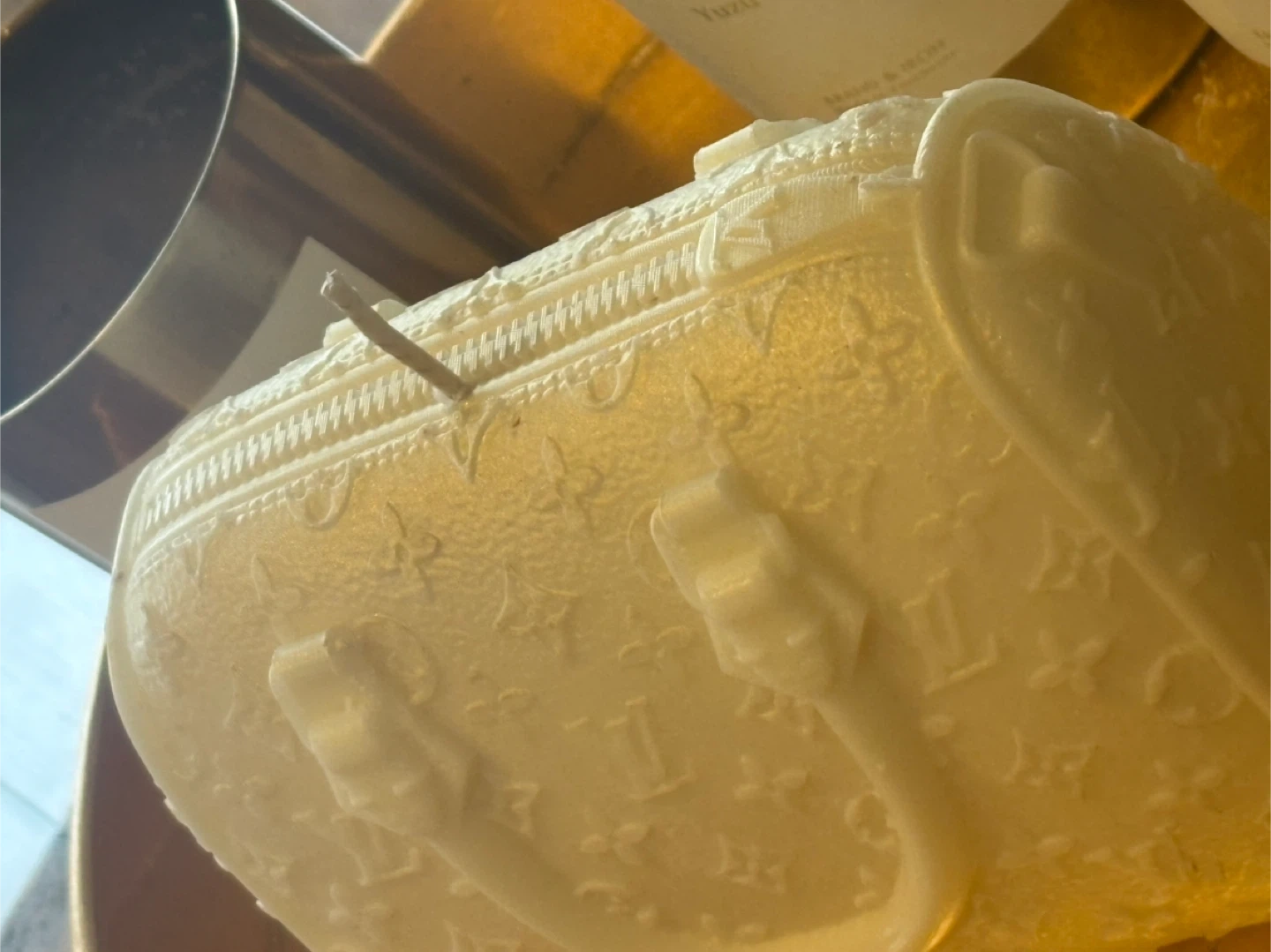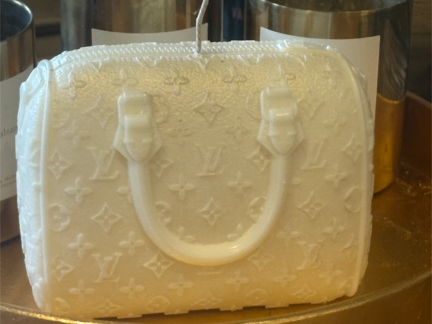 This is a cute decorative candle shaped like a Louis Vuitton Speedy bag! It's a unique piece to add to your home decor or give as a gift. The candle is white and features the classic LV monogram pattern.
