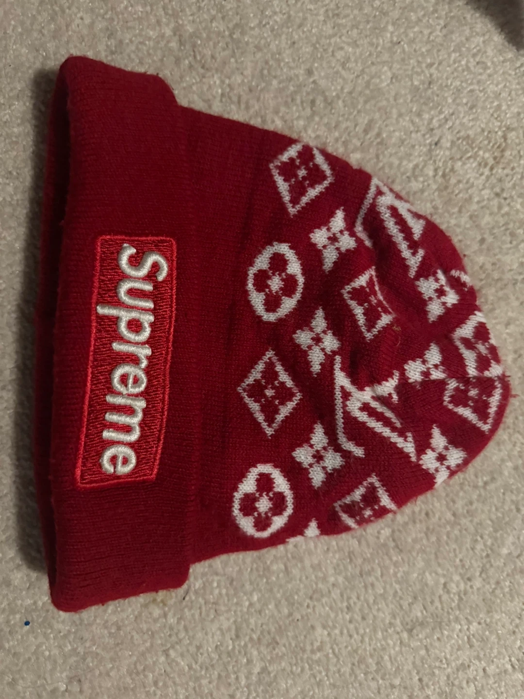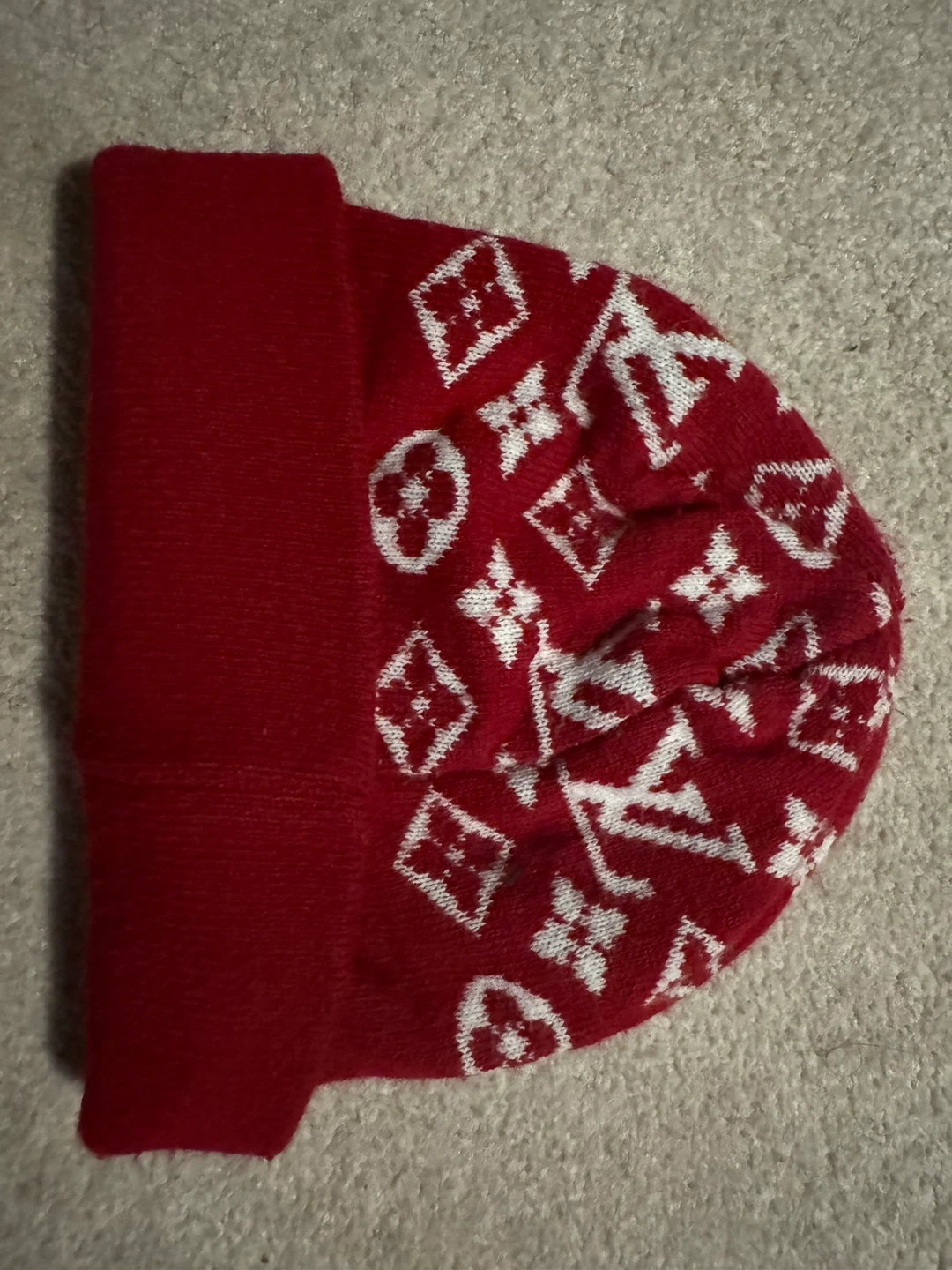 Selling a red Louis Vuitton x Supreme beanie. It's in great condition and features the iconic LV monogram pattern alongside the Supreme logo. Perfect for adding a touch of luxury to your winter wardrobe! 1:1 kids size